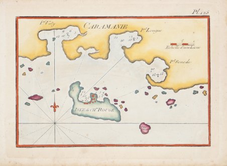 Piano nautico tratto dal " Recueil des principaux plans des ports & rades de la Méditerranée" di Josepgh Roux, pubblicato per la prima volta a Marsiglia nel 1764 e successivamente ristampato - ampliato - a Genova da Yves Gravier con il titolo "Recueil de 163 principaux plans des ports et rades de la Mediterranée" (1804).Ulteriore edizione dell'opera, con il titolo "Plans des ports ed des rades de la Mer Méditerranée." è stampata a Livorno da Carlo Tesi nel 1858. Incisione in rame, finemente acquarellata a mano, in ottimo stato di conservazione. First published in the "Recueil des principaux plans des ports et rades de la Mer Mediterranee", 1764, this nice nautical chart is taken from the rare "Plans des ports ed des rades de la Mer Méditerranée." published in Leghorn by Carlo Tesi, 1858. Copperplate with fine colouring, in very good condition. Cfr.