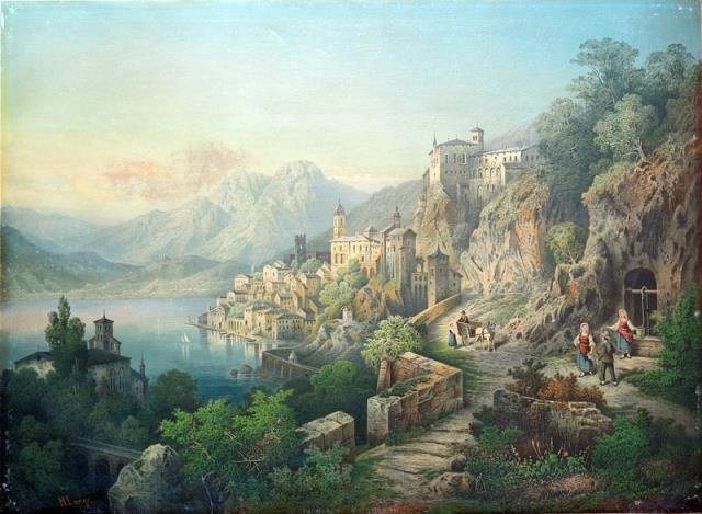 Berlino, 1880 circa. Cromolitografia, cm 57 x 78. Cromolitografia derivata dal dipinto firmato e titolato “Careno a Comersee”. Lo scenario è di ottima qualità e precisione descrittiva, animato da figure di popolani in primo piano, dotato di un considerevole scorcio paesistico; i monti, grandi e nitidi, sullo sfondo. Carenno (Carèn in dialetto locale) è un comune italiano della provincia di Lecco, in Lombardia, nella valle di San Martino e che, fino al 1922, apparteneva alla provincia di Bergamo. Borgo di origine medievale, e comune di mezza montagna, si estende in un’interessante scenografia paesaggistica che conserva luoghi in cui si respira ancora l’aria di una realtà contadina e montana di un tempo. Toni tendenti al giallo verde, buona conservazione.