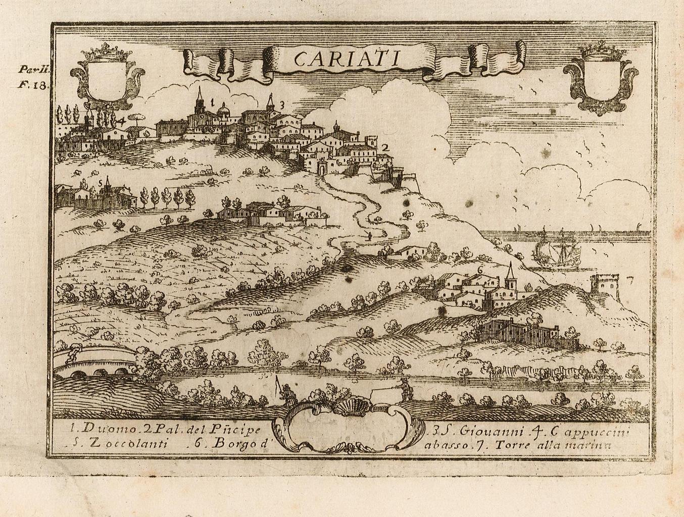 Stampa, antica ed originale, con veduta della cittadina e suoi dintorni, in calce rimandi da 1 a 7. Autore: Pacichelli Gio. Battista. Luogo: Cariati - Calabria. Anno: 1703. Tecnica: incisione in rame. Dimensioni: 124x170. Tratta dalla rara opera "Il Regno di Napoli / in prospettiva / diviso in dodeci provincie." pubblicata a Napoli da Michele L. Mutio nel 1703. Incisione stampata con inchiostro bruno. Restauro nell'angolo del margine inferiore sinistro