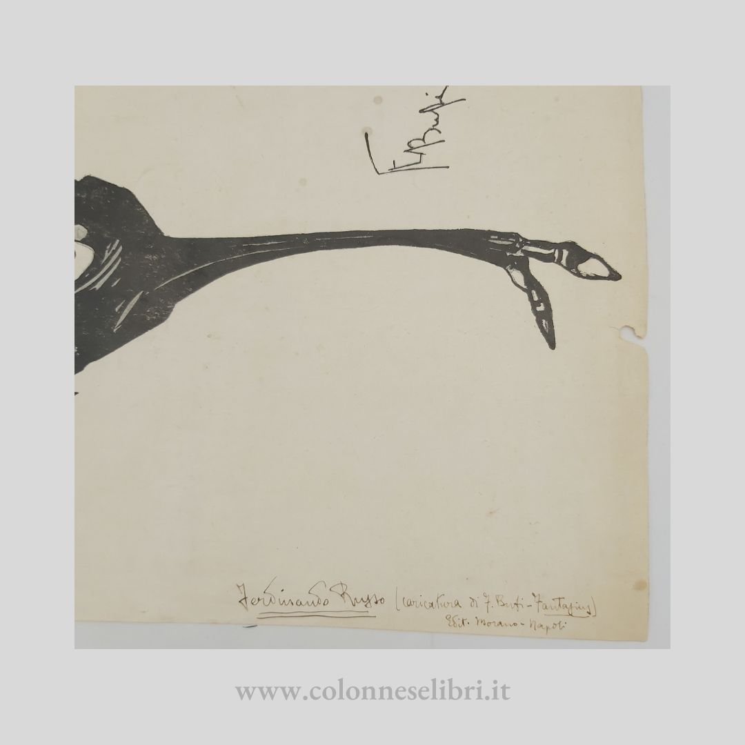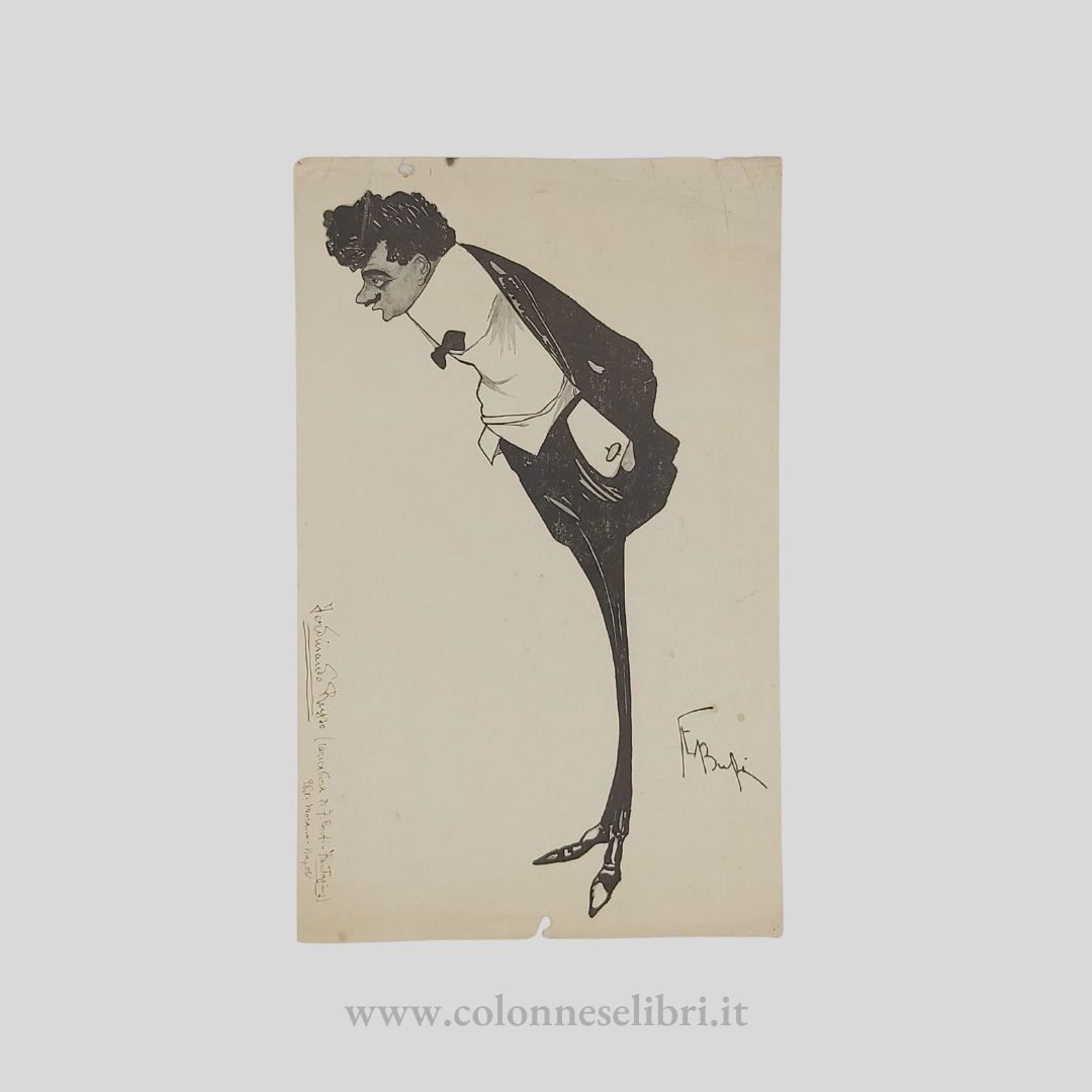 cm 16,5x27. Caricatura originale a stampa tipografica. A firma di Francesco Bufi. Didascalia a china di mano sincrona. Due piccoli buchetti ai margini bianchi, piegoline di cui una più insistente al margine bianco superiore lievi macchioline sempre in campo bianco. Piegatura centrale. Francesco Bufi [1885-1932]. Collaboratore di giornali umoristici (dove firmava con lo pseudonimo di Fantasius], noto caricaturista, Collaborò alla Piedigrotta di Ferdinando Russo, Piedigrotta Morano. Fu editore, cronista-capo de Il Mattino, proprietario e direttore del don Marzio, fondatore nel 1913 del settimanale umoristico Sei e Ventidue (soppresso poi dal fascismo nel 1930).