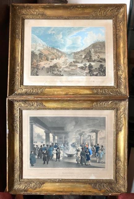 Vienne, Chez Tranquillo Mollo, 1820 circa. Da due dipinti di Eduard Gurk e edite da Tranquillo Mollo, coppia di acquatinte in colore d'epoca, cm 30 x 38 circa (il foglio), doppia didascalia in tedesco e francese. Eduard Gurk (Vienna, 1801 – Gerusalemme, 1841) fu pittore paesaggista, acquarellista e incisore austriaco. Molto apprezzzato nella cerchia delle sfere imperiali, fu al servizio della corte degli Asburgo sotto gli imperatori Francesco I e del primogenito Ferdinando I. Tranquillo Maria Laurentio Mollo (Bellinzona, 1767 – Svizzera? 1837) fu grafico, tipografo, editore e mercante d'arte e di musica a Vienna. Dal 1792 lavorò come assistente nella casa editrice “Artaria & Co.” di Vienna e poco dopo ne divenne socio, già nel 1793, insieme a Giovanni Cappi. Nel 1802 Artaria vendette la sua azienda a Mollo, rimanendone però socio. Nel 1804 Mollo si separò da Artaria e fondò, insieme a Franz Bernardini, una propria casa editrice musicale, la “T. Mollo & Co.” nella casa “Am Hof Nr. 346”, alla quale era annesso anche un negozio di arte e mappe. Come nuovo socio del suo studio assunse Domenico Artaria, figlio di Francesco Artaria. Fu così che in breve Mollo divenne uno dei più importanti editori d'arte e assunse la leadership nella produzione austriaca di mappe e mappamondi, collaborando con diversi cartografi, specie inglesi e francesi. Le due vedute rappresentano la nota e tranquilla cittadina di Carlsbad, uno dei centri termali più belli e apprezzati in Europa nonché la più celebre delle località termali della Repubblica Ceca, nota anche anche per la sua straordinaria architettura. Entrambe le vedute presentano margini con una usuale patina di ingiallimento (più visibile nella veduta dei dintorni di Sprudel) ma entrambe sono in buono stato di conservazione. Originali cornici d'epoca a legno e gesso dorato che, data la loro delicatezza, presentano alcuni difetti e riparazioni. .