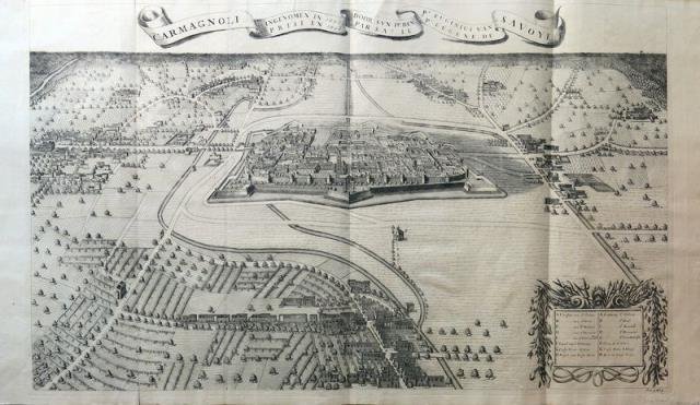 Francia, 1725 circa. Incisione in rame all’acquaforte, cm 51,5 x 84,5 (alla lastra) più margini. Titolo entro svolazzo lungo il margine superiore riportato in olandese e francese, in basso a ds. legenda in olandese e francese con otto siti; più sotto l’indicazione del tomo in cui la stampa è contenuta “Tom. I, N° 7”. Grande veduta a volo d’uccello, in oblungo e più volte ripiegata della città di Carmagnola, con pianta planimetrica e dintorni della campagna. Tratta dalla “Histoire Militaire du Prince Eugène de Savoye, du Prince et Duc de Marlborough, et du Prince de Nassau - Frise”, opera in tre volumi scritta da Jean Dumont Barone de Carlscroon (1660 - 1726) e ampliata dall’architetto Jean Rousset de Missy (1686 – 1762). Nell’opera si descrivono le battaglie del principe Eugenio di Savoia (1663 – 1736), del duca di Marlborough (1650 - 1722) e di Johann Willem Friso (1686 – 1711) principe d’Orange - Nassau. Essa ebbe edizioni in francese, olandese e inglese e le incisioni furono di Jean Huchtenburg (1647 - 1733) pittore, incisore, editore e mercante d’arte olandese che verso il 1708 - 1709 accompagnò il Principe Eugenio nelle sue campagne, dipingendo e incidendo le più importanti battaglie. La Savoia fu teatro di molte guerre e il Principe Eugenio fu in esse coinvolto già dal 1690 e per buona parte del 1700. Dal titolo della stampa si evince che il principe si impadronì di Carmagnola nel 1691. Si tratta di un’incisione ben dettagliata, che mostra una vista a volo d’uccello della città murata di Carmagnola e dei villaggi vicini, dotata di notevole senso di spazio e profondità. Consuete pieghe editoriali (un piccolo strappo ripristinato al margine inferiore segue una delle pieghe), peraltro fresca, ben impressa e a pieni margini, ottimo stato. Consuete pieghe editoriali (un piccolo strappo ripristinato al margine inferiore segue una delle pieghe), peraltro fresca, ben impressa e a pieni margini, ottimo stato. .