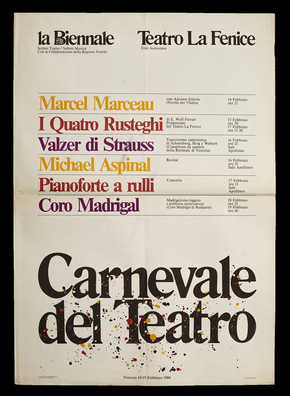Marcel Marceau, I Quatro Rusteghi, Valzer di Strauss, Michael Aspinal, Pianoforte a rulli, Coro Madrigal. La biennale - Teatro La Fenice, Venezia, 14-19 febbraio 1980, Messina & Montanari, Offset Commerciale - Venezia. Esemplare ripiegato, appena ingiallito, usura ai margini con strappetti