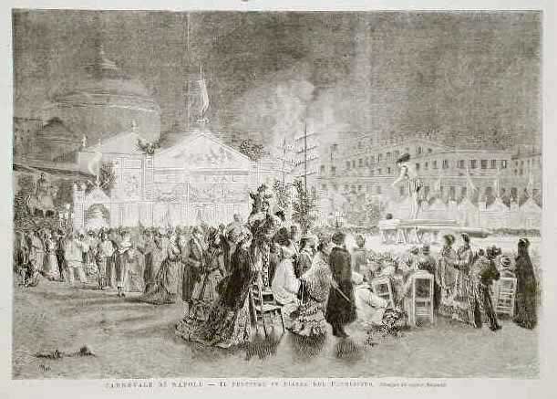 La piazza del Plebiscito gremita dalla folla, durante uno spettacolo per il carnevale. Testo al verso.