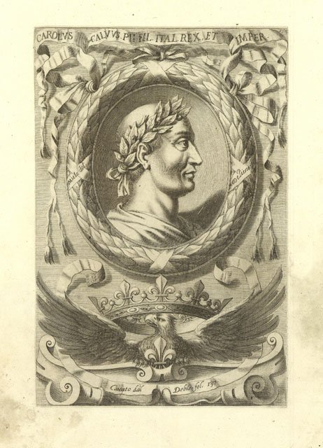 Ritratto, entro ricca cornice, di Carlo Calvo, re d'Italia e imperatore, figlio di Ludovico Pio