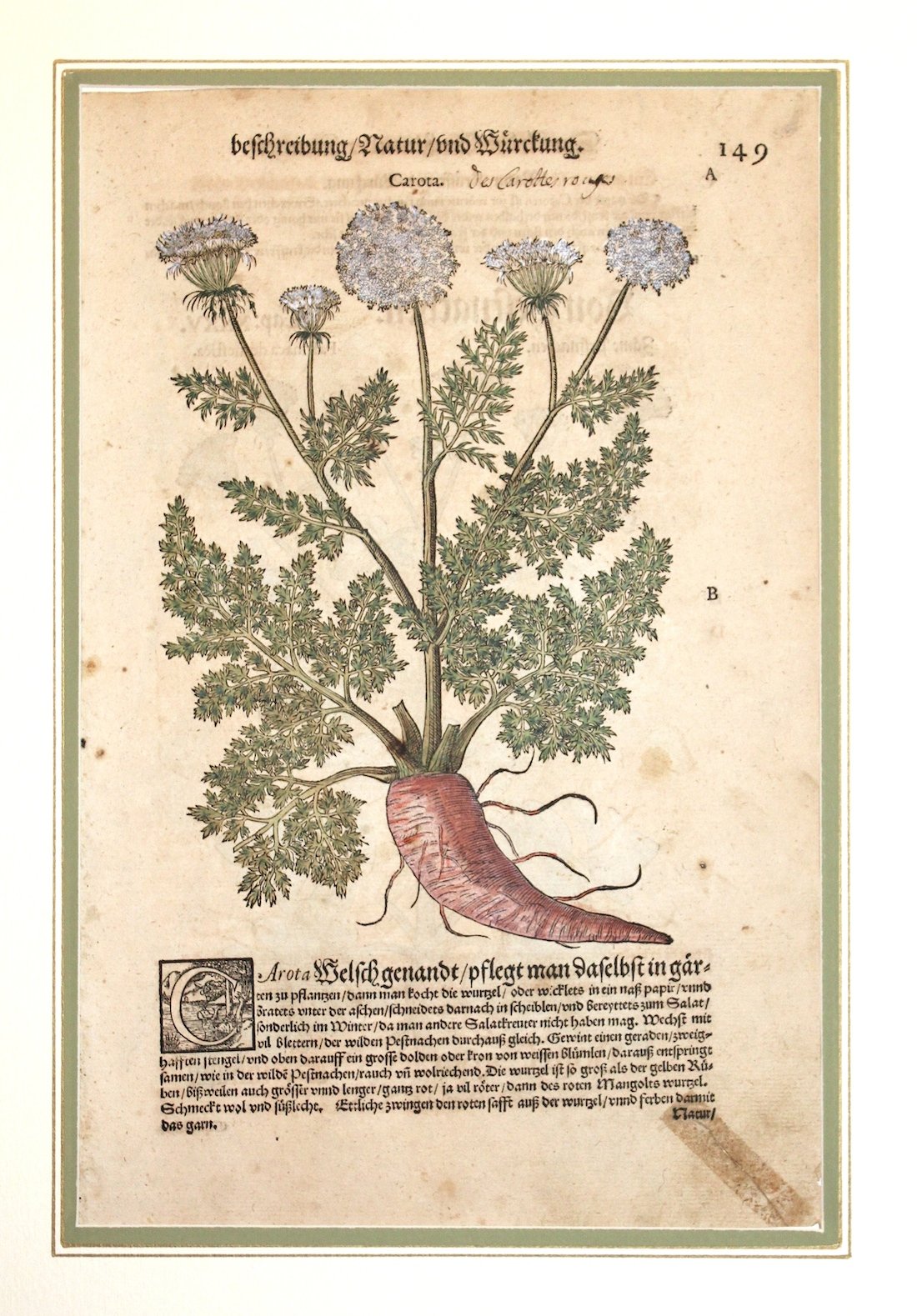 Silografia, coloritura coeva, mm 160x220. L'opera del medico senese, nata come commento a Dioscoride assunse, grazie alle numerose aggiunte relative alle nuove piante scoperte, notevole fama e fu una delle opere più importanti del secolo. Le belle illustrazioni derivano dall'edizione del 1555 e sono opera di Giorgio Liberale. "Mattioli's commentary on Dioscorides' text was aimed largely at the practical purpose of medicinal phytognosis and acquired intrinsic value both through the wealth of its descriptive details of each plant and through its accurate drawings. Mattioli may therefore be considered a member of the Vesalian school of morphological observation." (DSB). Antico restauro ad un angolo.