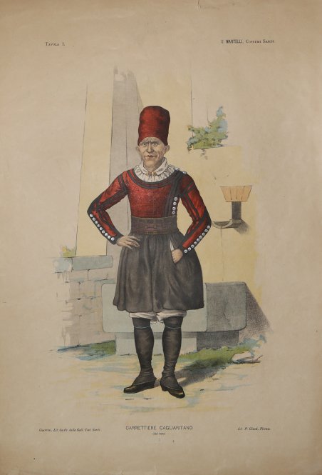 Litografia a colori curata da Valentino Martelli nel 1899, disegnata dal Guerrini e stampate a Firenze presso la stamperia Litografia Giusti. Il costume appartiene ad una serie di 13 tavole in litografia a colori opera di Puccioni (6) e di Guerrini (7) colorate dal vero dal Martelli. Si tratta di una raccolta particolarmente significativa per quanto riguarda l'antropologia sarda, pubblicata in cartella, negli stessi anni di altre opere analoghe come quella di Enrico Costa. In buono stato di conservazione. Litografia a colori curata da Valentino Martelli nel 1899, disegnata dal Guerrini e stampate a Firenze presso la stamperia Litografia Giusti. Il costume appartiene ad una serie di 13 tavole in litografia a colori opera di Puccioni (6) e di Guerrini (7) colorate dal vero dal Martelli. Si tratta di una raccolta particolarmente significativa per quanto riguarda l'antropologia sarda, pubblicata in cartella, negli stessi anni di altre opere analoghe come quella di Enrico Costa. In buono stato di conservazione. Cfr.