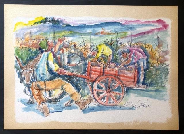 1965 circa. Acquarello su cartoncino, cm 49,5 x 69,5. In basso a destra la firma (non riconosciuta). Disegno e colore si accavallano in una soluzione grafica di effetto compositivo e tonale: il disegno emerge dai colori del rosso e dell'azzurro, contornati dalla vivacità, dell’arancio, del giallo, del verde e del rosa, a creare una scena vivacemente movimentata e narrativa.