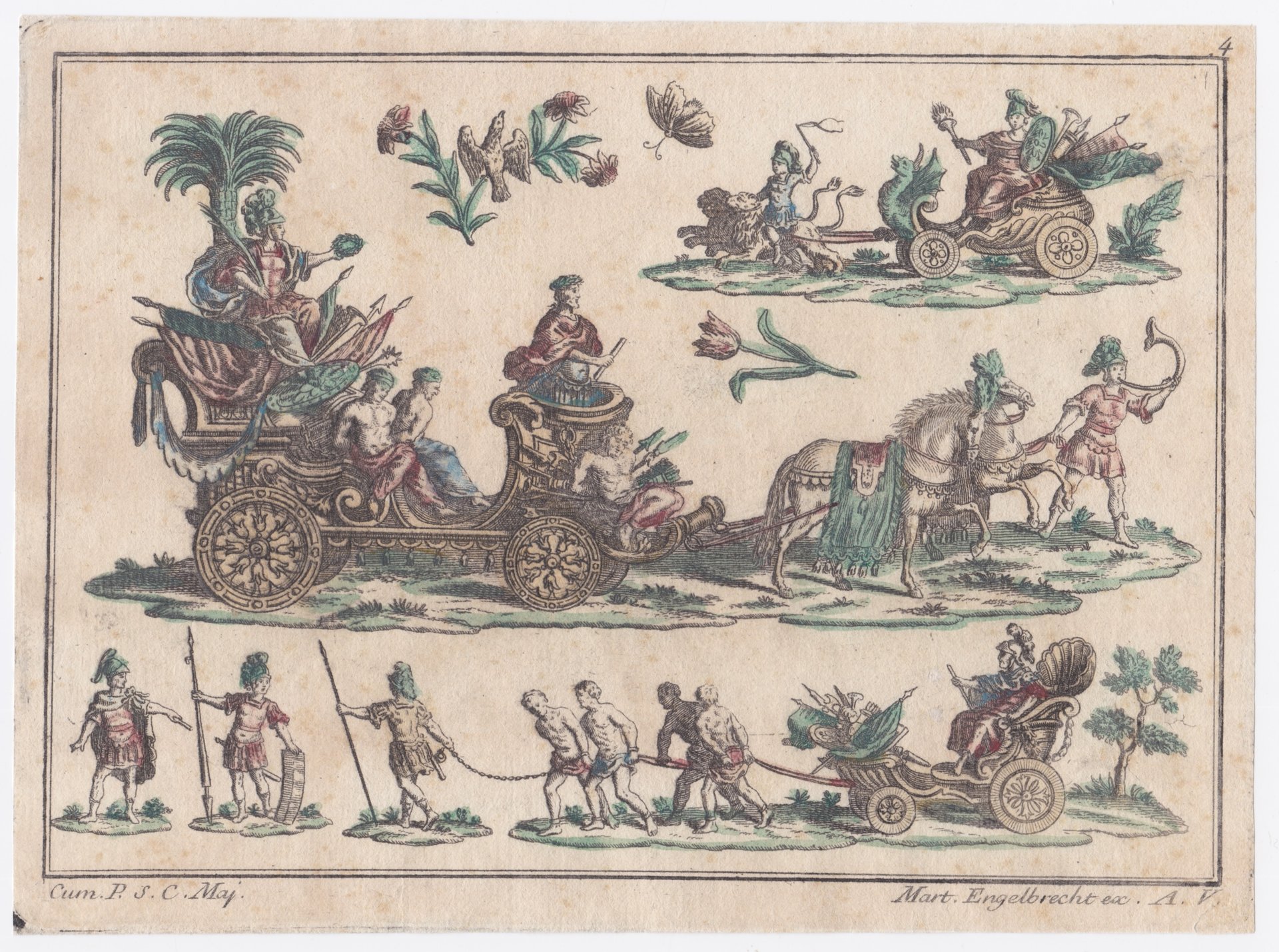 Il foglietto raffigurante tre carri trionfali, due figure singole di soldati, due fiori e una farfalla, doveva essere ritagliato e le figurine impiegate per decorare oggetti e mobili. La cosiddetta "lacca povera" che si diffuse nel XVIII secolo anche in Italia grazie alla produzione di stampe simili stampate a Bassano dai Remondini. Tali foglietti venivano chiamati "chinesi" per i loro soggetti insoliti e vagamente esotici. La composizione è chiusa entro doppio filetto e reca inciso in alto a destra il n 4. Il foglio doveva dunque essere parte di una serie. In basso oltre l'immagine è incisio "Cum P. S. C. Maj" (il copyright dell'epoca) e la firma dell'editore: Mart. Engelbrecht excud. A.V.
