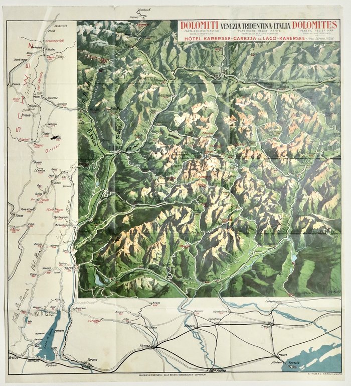 La "Carta a Rilievo Plastico delle Dolomiti" è una mappa tridimensionale storica, pubblicata dall'Hotel Karersee (Lago di Carezza) e creata da Joseph Ruep. Questo documento d'epoca, spesso associato al 1924, evidenzia la topografia delle Dolomiti, inclusi rilievi, valli e percorsi automobilistici. <BR>