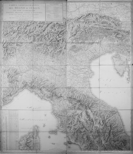 Carta amministrativa del Regno d'Italia co' suoi stabilimenti politici, militari, civili, e religiosi e con una parte degli Stati limitrofi, costrutta nel Deposito della Guerra per ordine del Ministro della Guerra, e Marina nell'anno MDCCCXI. Aggiunta e corretta nell'anno 1813. La presente carta è stata incisa sotto la vigilanza dei Sig. Gfaudenzio] Bordiga, Capo incisore nel Deposito della Guerra. Firma e data in lastra; luogo di edizione desumibile dal riferimento al Deposito della Guerra, avente sede a Milano. Orientazione assente, margine graduato lungo tutta la cornice, numerato; tre scale grafiche: "Miglia 30 Italiane di 60 al grado" (= 110 mm), "Leghe di Francia di 25 al grado", e "Chilometri" 30; scala naturale 1: 500 000 ["SCALE al 500.000 del terreno": entro il bordo inferiore, al foglio V, sopra quadro amministrativo-statistico. Carta dell'Italia del Nord e Centrale, sino a Roma, "aggiunta e corretta nell'anno 1813". Secondo stato di due (del 1811 il primo, del 1813 il secondo). I settori nn. 1 e 2 del foglio I, in alto a sinistra della carta, contengono il titolo, con a fianco, a destra, una "Ricapitolazione" di dati amministrativi (superficie, popolazione, numero di istituzioni presenti sul territorio, quali Prefetture, Tribunali, Università, Sedi Vescovili e Arcivescovili, etc.) e, sotto, la legenda dei "Segni Convenzionali", recante in calce una nota sulla costruzione della carta, con l'elenco le tavole prese in considerazione per la sua stesura. Fra le fonti indicate, oltre a carte e rilevazioni militari, viene segnalata per la Toscana una carta manoscritta realizzata dall'ingegnere Giovanni de Baillou che si conservava presso il Deposito della Guerra: "La parte del Regno d'Italia compresa fra la sinistra del Po, le Alpi e l'Isonzo, ad eccezione dell'ex Valtellina che fu militarmente riconosciuta, è stata tratta dalla grande carta topografica militare che rilevasi nel detto Regno; e il Dipartimento dell'Alto Adige dalla relativa carta topografica ceduta dalla Baviera. La parte poi del Regno alla dritta del Po è stata tutta riconosciuta militarmente. Riguardo ai paesi limitrofi, la Toscana è stata ricavata dalla carta manoscritta costrutta con accuratezza dal Chiarissimo Sig.r de' Baillou a Firenze, la parte delle Province Illiriche dalla grande carta Topog.ca di esse ceduta dall'Austria alla Francia. E il rimanente dalle migliori carte che si sono avute". Gaudenzio Bordiga (1773-1837), disegnatore e incisore attivo a Milano nella prima metà del XIX secolo, dove tra l'altro rivesti l'incarico di Capo incisore nel Deposito della Guerra. Deposito della Guerra di Milano era un ente istituito nel 1802 per assicurare, tra l'altro, la formazione, l'incisione, la verifica e la conservazione di ogni tipo di carte, sul modello dell'analogo omonimo Dépôt de la guerre di Parigi, originato dal "Bureau Topografico" operante al seguito delle Armate Francesi fin dal 1796 e che nel 1801 si stabili definitivamente a Milano. Dopo la caduta di Napoleone e il successivo Congresso di Vienna (1814-1815), sancita la costituzione del Regno Lombardo-Veneto, nel 1816 il "Deposito" fu trasformato nel più ampio "Instituto Geografico Militare dell'I. R. Stato Maggiore austriaco", conservando la sua sede a Milano. Esaurito il suo compito con la copertura cartografica quasi totale delle regioni centro-settentrionali dell'Italia, nel 1839 il "Deposito" fu poi trasferito a Vienna, dove assunse la denominazione di "K.u.K. Militär Geographischen Institut". Assai ricca di dettagli topografici: "La scrupolosa delineazione dei confini e l'abbondanza di segnalazioni sulla dislocazione delle sedi di uffici e magistrature di vario genere, rendevano la carta amministrativa funzionale alle esigenze dei dicasteri centrali e degli uffici periferici del Regno, presso cui essa ebbe in effetti un'ampia circolazione" (Signori, p. 523). Acquaforte, in sei fogli interi e due mezzi fogli, divisi in 28 settori montati su tela a stacchi. Dimensioni: . Carta amministrativa del Regno d'Italia co' suoi stabilimenti politici, militari, civili, e religiosi e con una parte degli Stati limitrofi, costrutta nel Deposito della Guerra per ordine del Ministro della Guerra, e Marina nell'anno MDCCCXI. Aggiunta e corretta nell'anno 1813. La presente carta è stata incisa sotto la vigilanza dei Sig. Gfaudenzio] Bordiga, Capo incisore nel Deposito della Guerra. Firma e data in lastra; luogo di edizione desumibile dal riferimento al Deposito della Guerra, avente sede a Milano. Orientazione assente, margine graduato lungo tutta la cornice, numerato; tre scale grafiche: "Miglia 30 Italiane di 60 al grado" (= 110 mm), "Leghe di Francia di 25 al grado", e "Chilometri" 30; scala naturale 1: 500 000 ["SCALE al 500.000 del terreno": entro il bordo inferiore, al foglio V, sopra quadro amministrativo-statistico. Carta dell'Italia del Nord e Centrale, sino a Roma, "aggiunta e corretta nell'anno 1813". Secondo stato di due (del 1811 il primo, del 1813 il secondo). I settori nn. 1 e 2 del foglio I, in alto a sinistra della carta, contengono il titolo, con a fianco, a destra, una "Ricapitolazione" di dati amministrativi (superficie, popolazione, numero di istituzioni presenti sul territorio, quali Prefetture, Tribunali, Università, Sedi Vescovili e Arcivescovili, etc.) e, sotto, la legenda dei "Segni Convenzionali", recante in calce una nota sulla costruzione della carta, con l'elenco le tavole prese in considerazione per la sua stesura. Fra le fonti indicate, oltre a carte e rilevazioni militari, viene segnalata per la Toscana una carta manoscritta realizzata dall'ingegnere Giovanni de Baillou che si conservava presso il Deposito della Guerra: "La parte del Regno d'Italia compresa fra la sinistra del Po, le Alpi e l'Isonzo, ad eccezione dell'ex Valtellina che fu militarmente riconosciuta, è stata tratta dalla grande carta topografica militare che rilevasi nel detto Regno; e il Dipartimento dell'Alto Adige dalla relativa carta topografica ced