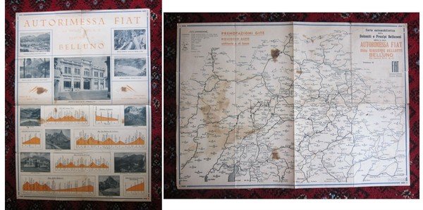 Carta automobilistica Dolomiti e Prealpi Bellunesi. Autorimessa FIAT Ditta Giuseppe Bellotti BELLUNO. Anni'20 ca.
