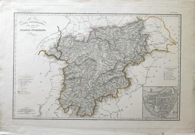 Tratta dall’atlante “Atlante geografico, fisico - storico, corografico dell’Italia”, Firenze, 1842 – 1845. Incisione in rame, b/n (confini in colore d’epoca), cm 38,5 x 60,2 (alla lastra) più margini bianchi. La carta comprende le Frazioni Territoriali Italiane incorporate nella Confederazione Elvetica e nell’Impero Austriaco. In basso a ds., entro riquadro, la pianta topografica di Trento. Buono stato di conservazione.