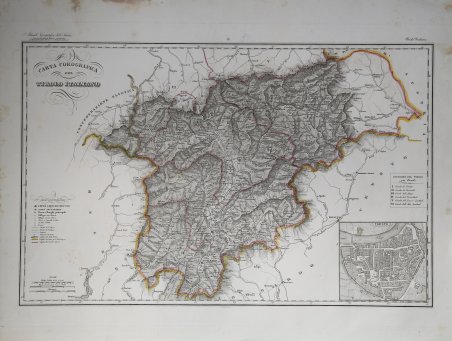 Carta geografica tratta dallâAtlante geografico degli Stati italiani delineato sopra le migliori e più moderne mappe per servire di corredo alla corografia fisica storica e statistica dell'Italia, di Attilio Zuccagni Orlandini stampato a Firenze, presso gli editori, 1844. In 2° massimo, 2 voll. Il primo volume contenente le carte dellâItalia Superiore in 52 fogli, il secondo volume quelle dellâItalia Inferiore in 77 fogli. Attilio Zuccagni Orlandini (1784-1872) nacque a Fiesole con il nome di Giuseppe Orlandini. In seguito allâadozione da parte del facoltoso zio materno Attilio Zuccagni (1754-1807), botanico e georgofilo, assunse il nome di Attilio Zuccagni Orlandini. La sua più importante opera è la relazione geografico-cartografica di tutti gli Stati preunitari italiani, la grandiosa Corografia fisica, storica e statistica dellâItalia e delle sue Isole (Firenze 1835-1845), in dodici volumi per diciannove tomi, con un volume introduttivo sullâintera penisola italiana. Lâopera costituì la summa delle centinaia di opere geografiche generali, regionali e locali allora disponibili e presentava, per ogni Stato preunitario, la trattazione fisica, storica, topografica e un inquadramento statistico. Nel 1844-45, la Corografia fu arricchita con cinque volumi di cartografie, vedute e altre illustrazioni di luoghi e monumenti: Atlante geografico degli Stati italiani delineato sopra le migliori e più moderne mappe (due volumi con 144 tavole inclusa la grande carta della penisola in 15 fogli) e Atlante illustrativo ossia raccolta dei principali monumenti italiani antichi, del medio evo e moderni e di alcune vedute pittoriche (tre volumi con 413 illustrazioni, stampate su 269 fogli). Le tavole furono incise, sempre a Firenze, in due apposite officine, da quattro valenti artisti lombardi (Vittorio Angeli, Giacinto Maina, Pietro Manzoni e Giuseppe Pozzi). Soprattutto il primo dei due atlanti rappresenta, ancora oggi, una pietra miliare nella storia della cartografia e dellâiconografia geografica italiana. Fu veramente âunâardua impresaâ, dal momento che spesso mancavano ancora (come, ad esempio, per il Ducato di Lucca e lo Stato Pontificio) prodotti cartografici compiutamente geometrici. I due prodotti furono presentati ai Georgofili nel 1843 e nel 1844, insieme alla mappa della Repubblica di San Marino. Lâopera si rivelò oltremodo costosa e non ottenne il successo commerciale sperato, ma servì da base per tante altre iniziative editoriali successive che vi attinsero, talora senza neppure rispettarne i diritti dâautore. Incisione in rame, coloritura coeva dei contorni, lievi ossidazioni, per il resto in ottimo stato di conservazione. Bibliografia Cfr. Anna Guarducci - Dizionario Biografico degli Italiani - Volume 100 (2020).
