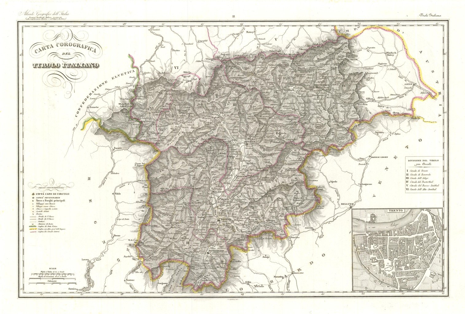 CCarta geografica, antica ed originale, con rappresentazione del Trentino Alto Adige. In basso a detra, entro riquadro, la piantina planimetrica della città di Trento. Inserita nel I volume dell'opera "Atlante Geografico degli Stati Italiani delineato sopra le migliori e più moderne mappe per servire di corredo alla Corografia Fisica Storica e Statistica dell'Italia" contenente le carte dell'Italia Superiore. Descritta da Attilio Zuccagni-Orlandini, edita e stampata a Firenze nel 1844-45. Autore: Zuccagni - Orlandini edit. & V. Angeli inc. Luogo: Trentino Alto Adige. Anno: 1844. Tecnica: incisione in rame. Dimensioni: 337x527 mm. L'incisione è caratterizzata da una coloritura coeva ai confini