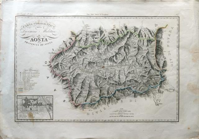 Tratta dall’ “Atlante geografico, fisico - storico, corografico dell’Italia”, Firenze, 1842 - 1845. Incisione in rame, b/n (confini in colore d’epoca), cm 45 x 64 circa (il foglio). In basso, a sn., una legenda con i principali segni convenzionali e in calce, in bs. a sn., il riquadro con la topografia di Aosta. Alcuni difetti e strappi marginali e alcune visibili macchie di umidità ma nell'insieme in discreto stato di conservazione.