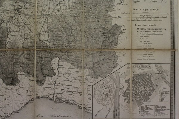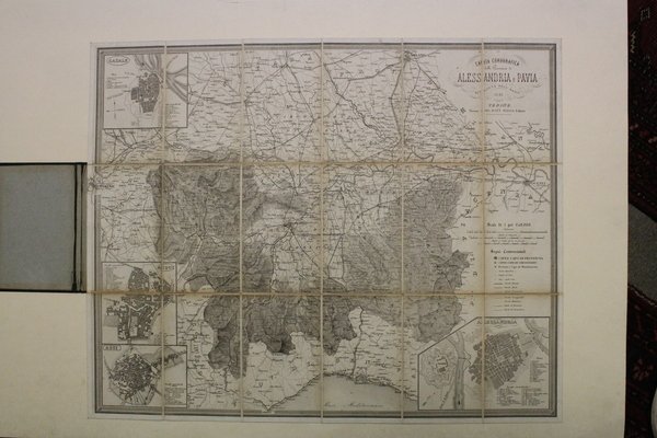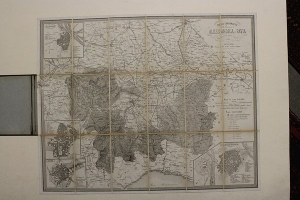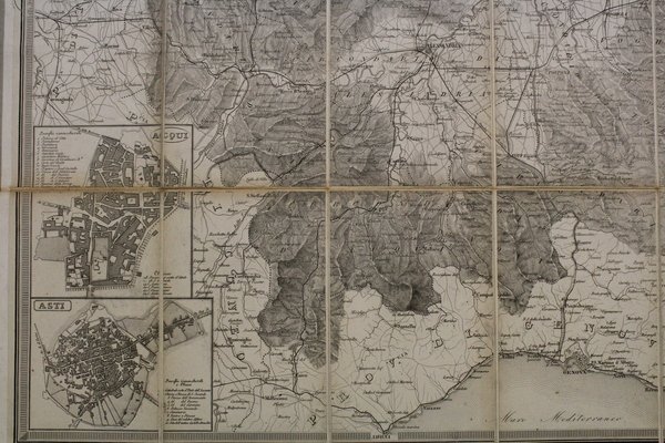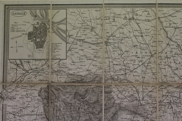 Carta corografica ripiegata e telata, suddivisa in 18 sezioni (mm 560x695). Con 4 riquadri ai lati che raffigurano le piante di Casale, Acqui, Asti e Alessandria. Percallina blu coeva con fregi a secco ai piatti. Ottimo esemplare.<BR>