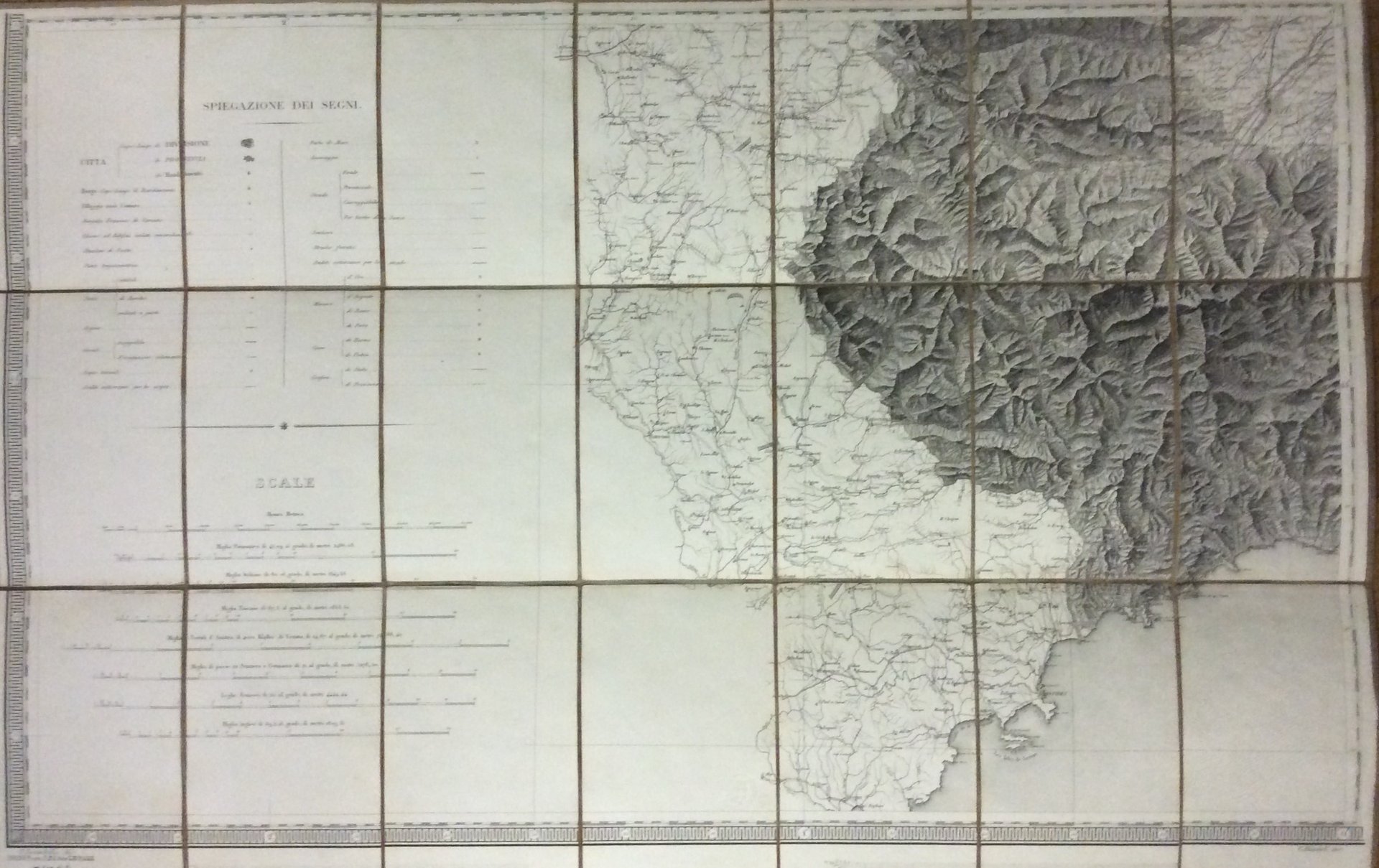 Carta topografica incisa in rame e montata su tela (cm. 53,5x82,5), suddivisa in 21 riquadri. Di questa carta composta da 6 fogli in scala 1:250.000, offriamo il Foglio 5 che contiene la leggenda dei segni convenzionali e le scale grafiche (8, in misure antiche italiane ed estere).Include la provincia di Cuneo. In basso a sinistra V. Brambilla dis., a destra: G. Biasioli inc.. Carta nota anche come "Carta Brambilla", dal nome del coordinatore del gruppo di topografi dello Stato Maggiore che eseguirono i rilievi per la realizzazione di una carta ufficiale dello Stato Sardo, tra 1816 e 1830. L'intenso lavoro di misurazione e rilevazione del territorio piemontese, compiuto tra 1816 e 1830 dal Reale Corpo di Stato Maggiore Generale, appena istituito, ebbe una prima stesura, manoscritta e non pubblicata, in 113 fogli (scala 1:50.000).Una riduzione in scala 1:250.000, in 6 fogli, fu stampata nel 1841 con il titolo "Carta degli Stati di sua Maestà Sarda in Terraferma", nota come "Carta Brambilla", della quale, nel 1846, venne pubblicata un'ulteriore riduzione in un unico foglio (1:500.000). La carta ebbe, probabilmente, successive edizioni. Revisioni e rielaborazioni della carta, portarono infine alla pubblicazione, tra 1852 e 1867, della nuova versione della "Carta topografica degli Stati in Terraferma di S.M. il Re di Sardegna" in 91 fogli (scala 1:50.000), che subì un'ulteriore revisione tra 1871 e 1874. Tale carta costituì la base delle successive carte dellIGM (Istituto Geografico Militare) per la rappresentazione dello Stato unitario.Cfr. F. Barrera, Il Piemonte nella cartografia degli Stati Sardi tra Restaurazione e Unità d'Italia, n. 44-49 (ed. 1846) - L. e G. Aliprandi, Le grandi Alpi ( 2005), v. 1, pp. 116-117.Ben conservata..