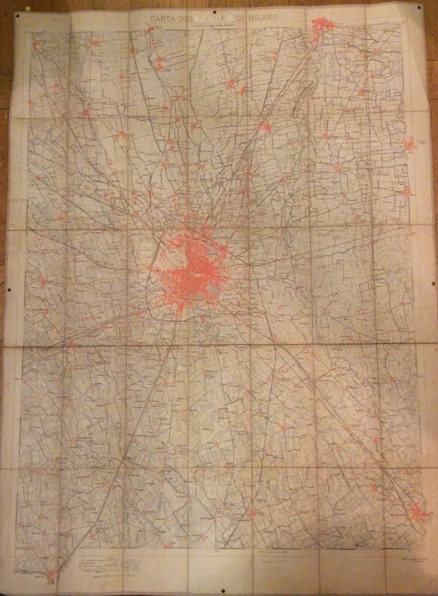 Grande carta topografica a colori (cm. 120 x 88,54), montata su tela, suddivisa in 35 riquadri. Scala 1 a 25.000. Ben conservata.