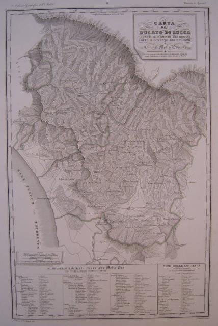 CARTA DEL DUCATO DI LUCCA AVANTI IL DOMINIO DEI ROMANI, SOTTO IL GOVERNO DEI MEDESIMI E NEL MEDIO EVO. Incisione originale su rame di G.Maina e V.Stanghi tratta da "Atlante Geografico degli Stati Italiani, delineata sopra le migliori e più moderne mappe per servire di corredo alla Corografia Fisica Storica e Statistica dell'Italia" di Attilio Zuccagni Orlandini.