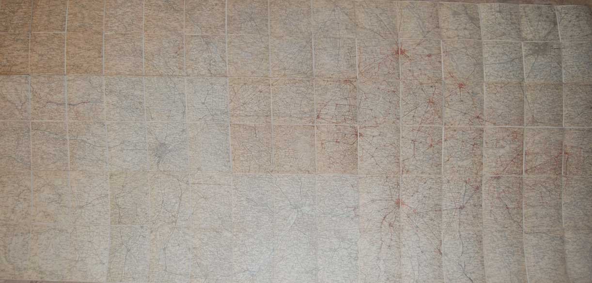 Grande carta geografica a colori, di cm. 112 x 200, montata su tela e suddivisa in 90 riquadri, raffigurante il territorio tra Torino e Milano, con relativi elettrodotti a 130 KV.Buon esemplare.