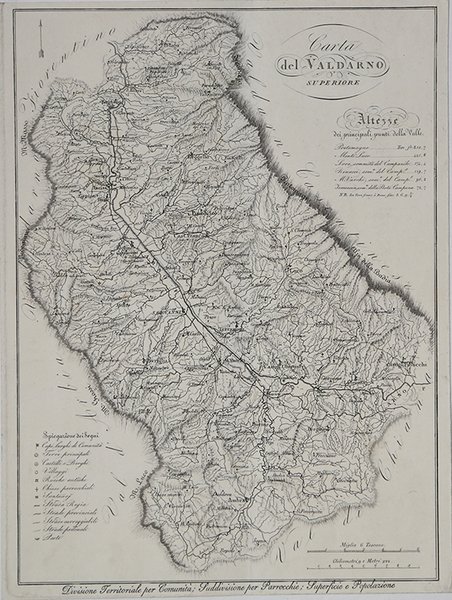 Carta geografica tratta dall’Atlante geografico degli Stati italiani delineato sopra le migliori e più moderne mappe per servire di corredo alla corografia fisica storica e statistica dell'Italia, di Attilio Zuccagni Orlandini stampato a Firenze, presso gli editori, 1844. In 2° massimo, 2 voll. Il primo volume contenente le carte dell’Italia Superiore in 52 fogli, il secondo volume quelle dell’Italia Inferiore in 77 fogli. Attilio Zuccagni Orlandini (1784-1872) nacque a Fiesole con il nome di Giuseppe Orlandini. In seguito all’adozione da parte del facoltoso zio materno Attilio Zuccagni (1754-1807), botanico e georgofilo, assunse il nome di Attilio Zuccagni Orlandini. La sua più importante opera è la relazione geografico-cartografica di tutti gli Stati preunitari italiani, la grandiosa Corografia fisica, storica e statistica dell’Italia e delle sue Isole (Firenze 1835-1845), in dodici volumi per diciannove tomi, con un volume introduttivo sull’intera penisola italiana. L’opera costituì la summa delle centinaia di opere geografiche generali, regionali e locali allora disponibili e presentava, per ogni Stato preunitario, la trattazione fisica, storica, topografica e un inquadramento statistico. Nel 1844-45, la Corografia fu arricchita con cinque volumi di cartografie, vedute e altre illustrazioni di luoghi e monumenti: Atlante geografico degli Stati italiani delineato sopra le migliori e più moderne mappe (due volumi con 144 tavole inclusa la grande carta della penisola in 15 fogli) e Atlante illustrativo ossia raccolta dei principali monumenti italiani antichi, del medio evo e moderni e di alcune vedute pittoriche (tre volumi con 413 illustrazioni, stampate su 269 fogli). Le tavole furono incise, sempre a Firenze, in due apposite officine, da quattro valenti artisti lombardi (Vittorio Angeli, Giacinto Maina, Pietro Manzoni e Giuseppe Pozzi). ' Soprattutto il primo dei due atlanti rappresenta, ancora oggi, una pietra miliare nella storia della cartografia e dell’iconografia geografica italiana. Fu veramente ‘un’ardua impresa’, dal momento che spesso mancavano ancora (come, ad esempio, per il Ducato di Lucca e lo Stato Pontificio) prodotti cartografici compiutamente geometrici. I due prodotti furono presentati ai Georgofili nel 1843 e nel 1844, insieme alla mappa della Repubblica di San Marino. L’opera si rivelò oltremodo costosa e non ottenne il successo commerciale sperato, ma servì da base per tante altre iniziative editoriali successive che vi attinsero, talora senza neppure rispettarne i diritti d’autore. Incisione in rame, coloritura coeva dei contorni, lievi ossidazioni, per il resto in ottimo stato di conservazione. ' Bibliografia Cfr. Anna Guarducci - Dizionario Biografico degli Italiani - Volume 100 (2020). Map taken from the Atlante geografico degli Stati italiani delineato sopra le migliori e più moderne mappe per servire di corredo alla corografia fisica storica e statistica dell'Italia, di Attilio Zuccagni Orlandini printed in Florence, 1844. The first volume contains the maps of Northern Italy in 52 sheets, the second volume those of Southern Italy in 77 sheets. Attilio Zuccagni Orlandini (1784-1872) was born in Fiesole under the name of Giuseppe Orlandini. Following adoption by his wealthy maternal uncle Attilio Zuccagni (1754-1807), a botanist and georgofile, he took the name Attilio Zuccagni Orlandini. His most important work is the geographic-cartographic report of all the pre-unification Italian states, the great Corografia fisica, storica e statistica dell'Italia e delle sue Isole (Florence 1835-1845), in twelve volumes for nineteen tomes, with an introductory volume on the entire Italian peninsula. The work constituted the sum of hundreds of general, regional and local geographic works then available and presented, for each pre-unification state, the physical, historical, topographical and statistical framework. In 1844-45, the Corografia was enriched with five volumes of maps, views and other illustrations of places and monuments: Atlante geografico degli Stati italiani delineato sopra le migliori e più moderne mappe (two volumes with 144 plates including the large map of the peninsula in 15 sheets) and Atlante illustrativo ossia raccolta dei principali monumenti italiani antichi, del medio evo e moderni e di alcune vedute pittoriche (three volumes with 413 illustrations, printed on 269 sheets). The plates were engraved, again in Florence, in two special workshops, by four talented Lombard artists (Vittorio Angeli, Giacinto Maina, Pietro Manzoni and Giuseppe Pozzi). ' Especially the first of the two atlases represents, even today, a milestone in the history of cartography and Italian geographic iconography. It was truly 'an arduous undertaking', since cartographic products were often still lacking (as, for example, for the Duchy of Lucca and the Papal States) fully geometric. The two products were presented to the Georgofili in 1843 and 1844, along with the map of the Republic of San Marino. The work proved to be very expensive and did not achieve the commercial success hoped for, but served as a basis for many other subsequent publishing initiatives that drew on it, sometimes without even respecting the copyright. ' Copperplate with fine outline colour, good condition. ' Literature Anna Guarducci - Dizionario Biografico degli Italiani - Volume 100 (2020). Cfr.