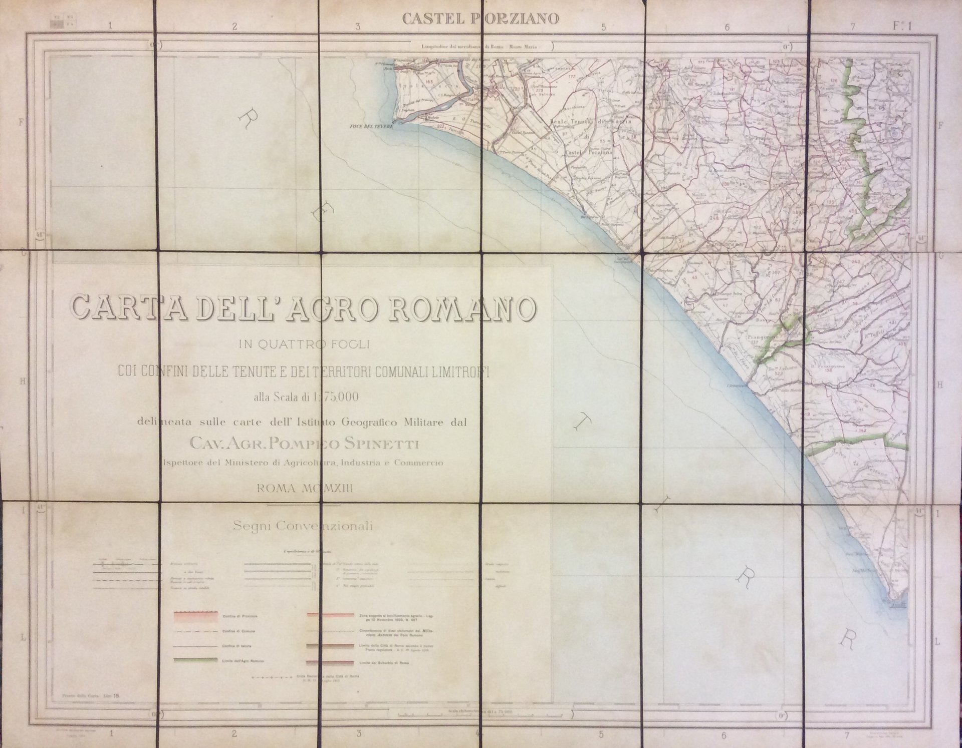 CARTA DELL'AGRO ROMANO IN QUATTRO FOGLI COI CONFINI DELLE TENUTE E DEI TERRITORI COMUNALI LIMITROFI. - Alla Scala Di 1:75,000 Delineata Sulle Carte Dell'Istituto Geografico Militare, dal Cav. Agr. Pompeo Spinetti, Ispettore del Ministero di Agricoltura, Industria e Commercio, Roma MCMXIII (1913).