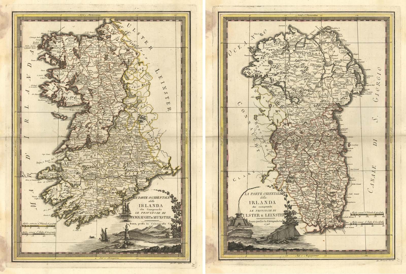 Carta geografica, in due fogli, raffigurante i territori dell'Irlanda. Il primo foglio con le province di Connaught e Munster. Il secondo con le province di Ulster e Leinster.L'incisione è caratterizzata da una gradevole acquerellatura confinale coeva. Alcune macchie nel margine sinistro di ogni foglio che non compromettono il generale buono stato di conservazione. La carta si trova inserita nel secondo volume dell'opera "Nuovo Atlante Geografico Universale delineato sulle ultime osservazioni" pubblicato nel 1792, che venne commissionato al Cassini dalla Calcografia Camerale di Roma. Successivamente vennero pubblicati il secondo ed il terzo volume rispettivamente nel 1797 e nel 1801.