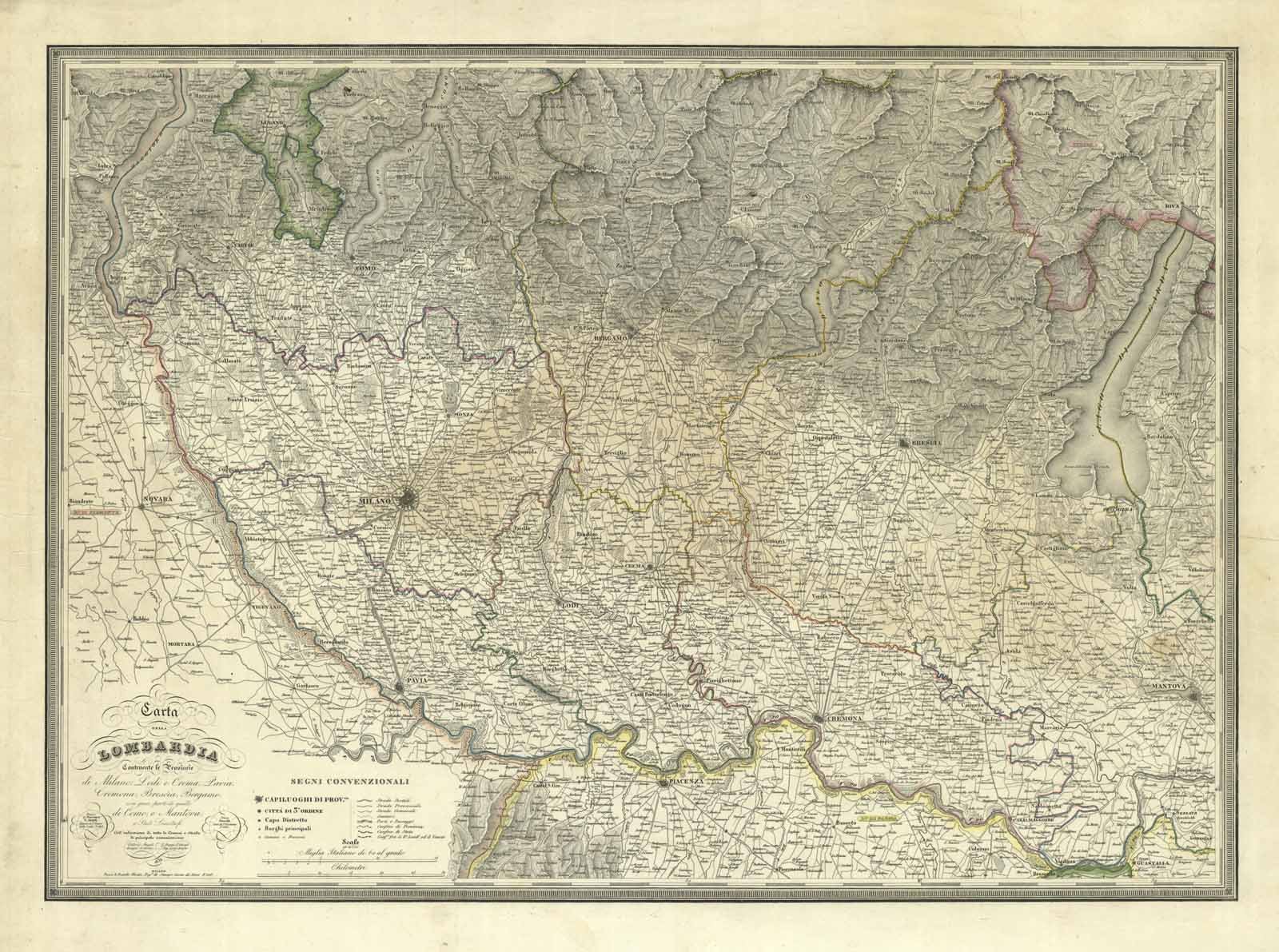 Carta geografica raffigurante il territorio della Lombardia e parte di quelli confinanti racchiusa entro margine graduato e decorativa cornice. Sulla sinistra è ben indicato il confine con il Regno del Piemonte che divide in due il lago Maggiore e successivamente segue il corso del fiume Ticino, suo emissario, fino all'incrocio con il Po'; sulla destra è indicato il confine con il Veneto che divide in due il lago di Garda e segue il corso del suo emissario, il fiume Mincio, fino all'altezza di Volta. Si trovano altresì indicati i confini con il Ducato di Parma e Piacenza, la Svizzera con l'enclave di Campione ed il Tirolo. Per qunato rigurda il territorio lombardo, come dichiarato nel titolo, sono esplicitate le province: Milano, Pavia, Lodi, Crema, Bergamo, Brescia, Cremona, Mantova e Como; di queste ultime due manca la raffigurazione di una porzione di territorio. Ogni capoluogo di Provincia è contraddistinto dalla raffigurazione in pianta della città. L'orografia è trattata a tratteggio con luce zenitale che conferisce particolare rilievo alle zone montuose. Nell'angolo in baaso a sinistra troviamo il titolo, la legenda e le scale grafiche in 15 Miglia Italiane di 60 al grado e 30 Chilometri. La carta è caratterizzata da una vivace coloritura confinale coeva all'acquerello, ampi margini e stato di conservazione complessivamente ottimo. Rara, si trova menzione della carta nel "Manuale Bibliografico del Viaggiatore in Italia." di Pietro Lichtenthal pubblicato a Milano nel 1834 in cui a p. 350 si legge indicazione dell'edizione uscita proprio quell'anno.