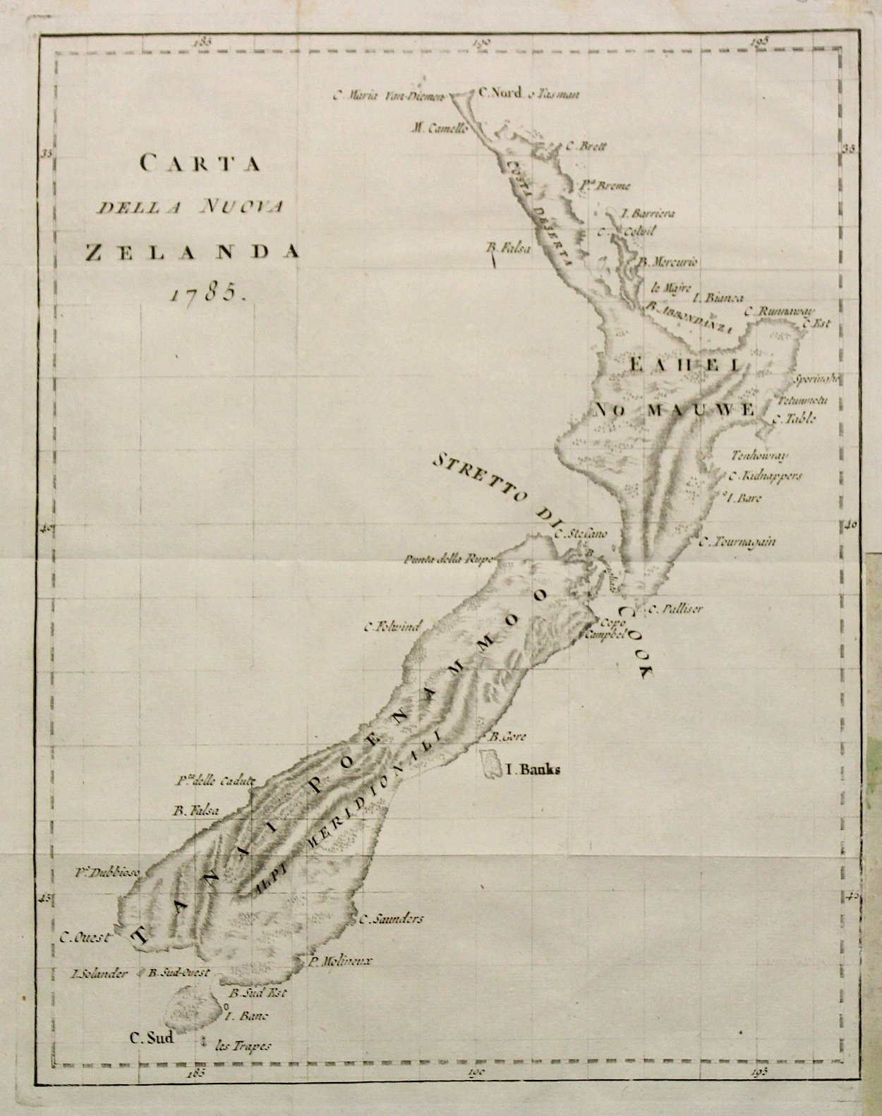 Copper engraving, mm 300 x 240. Interesting early map after Cook. Published in "Compendio della Storia Generale de Viaggi…", an abridged italian edition of Prévost's "Histoire Generale des Voyages". Very good condition with usual traces of original binding folds.<BR>