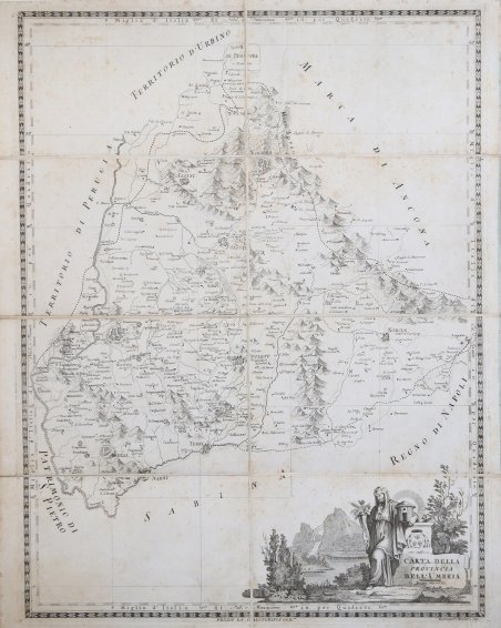 Carta geografica dell'Umbria stampata a Roma da Bernardino Olivieri. Dal punto di vista tecnico è tracciato il reticolato geografico con maglie rispondenti a 10' di latitudine per 10 ' di longitudine. Orografia a monticelli con tratteggio a luce obliqua, abitati rappresentati in pianta, strade e confini. La carta è arricchita da una cornice e da decorativo cartiglio in cui è riportato il titolo della stessa. ' ' Le coordinate geografiche della carta derivano ancora dalle misurazioni effettuate da Maire e Boschovic per quella dello Stato pontificio da loro pubblicata nel 1755 ed anche le variazioni topografiche sono impercettibili. ' Stampata a Roma presso la Calcografia Camerale, è incisa da Bernardo Olivieri. Appartiene ad una sorta di “atlante” delle provincie dello Stato della Chiesa; stampate singolarmente, non furono mai raccolte con un frontespizio. ' “Bella ed elegante la figurazione in basso a destra, l'Umbria è rappresentata come una donna velata che sorregge con una mano una cornucopia e con l'altra un tempietto circolare. Sul fondo la Cascata delle Marmore con arcobaleno (elementi che compaiono anche nelle carte del Ducato di Spoleto del Blaeu e dello Jansson). In una pietra il titolo e la data "Carta della Provincia dell'Umbria, Roma 1803". In ogni lato della carta la scritta: "Miglia d'Italia di 10 per Quadrato" orientazione nei quattro lati con la doppia denominazione dei punti cardinali "Nord o Tramontana", "Sud o Mezzogiorno", "Est o Le- vante", "Ovest o Ponente". All'esterno della cornice decorativa in basso al centro: "Presso la Calcografia Cam.lk", a destra "Bernard." Olivieri inc.". Carta con graduazione ai margini, reticolato geografico. Tavola priva di scala. Nella carta viene rappresentata la sola provincia dell'Umbria, qui delimitata, a sinistra dal fiume Tevere, a destra dall'Ap- pennino ed a sud dal fiume Nera. Ben dettagliata e rappresentata con doppia linea tratteggiata la rete stradale sia principale che secondaria, con grande attenzione per le strade che convergevano verso le città più importanti. Nella carta è riportata anche la strada, voluta da Urbano VIII nel 1634, che dalla Flaminia si diramava poco prima di Strettura e passando per Fe- rentillo - Salto del Cieco raggiungeva Monteleone dove si trovavano le miniere di ferro dello Stato Pontificio, per giungere poi definitivamente a Norcia. Raffigurata con ricchezza di dettaglio l'idrografia, ma ad eccezione del Tevere e del Topino nessun fiume è indicato con il nome. Sommaria e poco curata l'orografia, dove con il proprio nome sono citati solo gli Ap- pennini e Monte Cuscerno. Molto ricca e ben posizionata la toponomastica, le città più importanti sono indicate con pic- cole piante topografiche, le altre località con piccoli tratti diritti o a L più o meno numerosi a seconda dell'importanza. Qualche nome inesatto Pollino per Polino, Cappetone per Capitone. I confini sono segnati con linea tratteggiata” (cfr. Alla ricerca dei confini. L’umbira nella cartografia storica dal XVI secolo all’Unità d’Italia, p. 118, tav. 41). Bernardo o Bernardino Olivieri fu incisore ad acquaforte, nativo ed attivo a Roma ai primi del XIX secolo. Olivieri è noto soprattutto per il suo piccolo atlante dello Stato Pontificio di dodici carte, pubblicatogli dalla Calcografia Camerale di Roma fra il 1802 ed il 1813. Dell'Olivieri si ricordano anche numerose stampe di vedute romane ed anche una originale pianta topografica del centro storico urbano diviso in quattordici Rioni (Roma 1814). “Non si hanno molte notizie biografiche di Bernardino Olivieri (1770 ca-1845 ca), incisore, calcografo, editore del quale non si conoscono né il luogo di nascita, anche se nelle sue incisioni si definisce romano, né quello della morte, ma sappiamo che ha lavorato sempre presso la Calcografia Camerale di Roma, allora situata nel palazzo di Propaganda Fide. Per quello che conosciamo delle sue opere, si può affermare che lavorò almeno dal 1795, . Carta geografica dell'Umbria stampata a Roma da Bernardino Olivieri. Dal punto di vista tecnico è tracciato il reticolato geografico con maglie rispondenti a 10' di latitudine per 10 ' di longitudine. Orografia a monticelli con tratteggio a luce obliqua, abitati rappresentati in pianta, strade e confini. La carta è arricchita da una cornice e da decorativo cartiglio in cui è riportato il titolo della stessa. ' ' Le coordinate geografiche della carta derivano ancora dalle misurazioni effettuate da Maire e Boschovic per quella dello Stato pontificio da loro pubblicata nel 1755 ed anche le variazioni topografiche sono impercettibili. ' Stampata a Roma presso la Calcografia Camerale, è incisa da Bernardo Olivieri. Appartiene ad una sorta di “atlante” delle provincie dello Stato della Chiesa; stampate singolarmente, non furono mai raccolte con un frontespizio. ' “Bella ed elegante la figurazione in basso a destra, l'Umbria è rappresentata come una donna velata che sorregge con una mano una cornucopia e con l'altra un tempietto circolare. Sul fondo la Cascata delle Marmore con arcobaleno (elementi che compaiono anche nelle carte del Ducato di Spoleto del Blaeu e dello Jansson). In una pietra il titolo e la data "Carta della Provincia dell'Umbria, Roma 1803". In ogni lato della carta la scritta: "Miglia d'Italia di 10 per Quadrato" orientazione nei quattro lati con la doppia denominazione dei punti cardinali "Nord o Tramontana", "Sud o Mezzogiorno", "Est o Le- vante", "Ovest o Ponente". All'esterno della cornice decorativa in basso al centro: "Presso la Calcografia Cam.lk", a destra "Bernard." Olivieri inc.". Carta con graduazione ai margini, reticolato geografico. Tavola priva di scala. Nella carta viene rappresentata la sola provincia dell'Umbria, qui delimitata, a sinistra dal fiume Tevere, a destra dall'Ap- pennino ed a sud dal fiume Nera. Ben dettagliata e rappresentata con doppia linea tratteggiata la rete stradale sia principale che secondaria, con grande attenzi