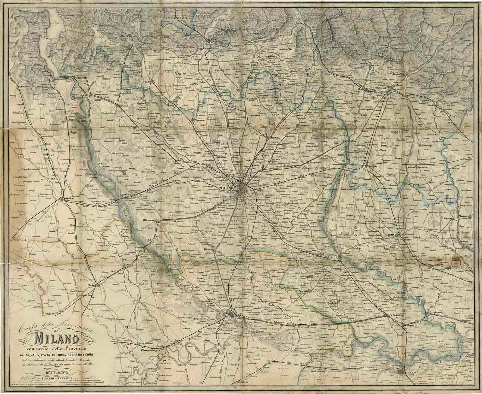 Carta a stacchi, applicata su supporto cartaceo, raffigurante il territorio di Milano, Novara, Pavia, Cremona, Bergamo e Como. Vi sono segnati i tracciati delle strade ferrate, di cui è evidenziato il chilometraggio tra una stazione e l’altra. Coloritura coeva, alcuni restauri. Bibliografia: Arrigoni-Bertarelli, n. 1302