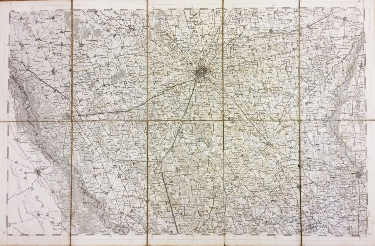 Carta di cm. 46 x 70, inc. in rame e montata su tela, suddivisa in 10 riquadri. Sono comprese le province di Milano, Lodi e Vigevano. Esemplare ben conservato.