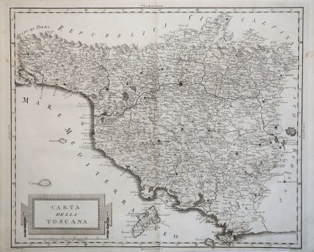 Carta geografica del Granducato di Toscana disegnata da Giuseppe Puliti ed incisa da Cosimo Zocchi per il ' Viaggio pittorico della Toscana ' dell'abate Francesco Fontani stampato a Firenze da Giuseppe Tofani, 1801. In basso da sinistra a destra "Gius. Puliti dis." e "Cosimo Zocchi inc.". Carta geo-topografica della Toscana, entro riquadro a filo, con graduazioni, scala, grande cartiglio col titolo e, fuori dal riquadro, i punti cardinali. Compresa tra gli Stati confinanti (Repubblica Ligure, Stato di Parma, Repubblica Cisalpina e Stato Romano) e naturalmente il Mar Tirreno, si presenta ricca di toponimi e con ben evidenziata la linea di costa, ombreggiata da sottile tratteggio orizzontale, l’orografia, i fiumi e i laghi e naturalmente le isole dell’arcipelago, con l’Elba che presenta ancora forma e posizione piuttosto strane. Bel foglio, in perfetto stato di conservazione. Carta geografica del Granducato di Toscana disegnata da Giuseppe Puliti ed incisa da Cosimo Zocchi per il ' Viaggio pittorico della Toscana ' dell'abate Francesco Fontani stampato a Firenze da Giuseppe Tofani, 1801. In basso da sinistra a destra "Gius. Puliti dis." e "Cosimo Zocchi inc.". Carta geo-topografica della Toscana, entro riquadro a filo, con graduazioni, scala, grande cartiglio col titolo e, fuori dal riquadro, i punti cardinali. Compresa tra gli Stati confinanti (Repubblica Ligure, Stato di Parma, Repubblica Cisalpina e Stato Romano) e naturalmente il Mar Tirreno, si presenta ricca di toponimi e con ben evidenziata la linea di costa, ombreggiata da sottile tratteggio orizzontale, l’orografia, i fiumi e i laghi e naturalmente le isole dell’arcipelago, con l’Elba che presenta ancora forma e posizione piuttosto strane. Bel foglio, in perfetto stato di conservazione. Cfr.