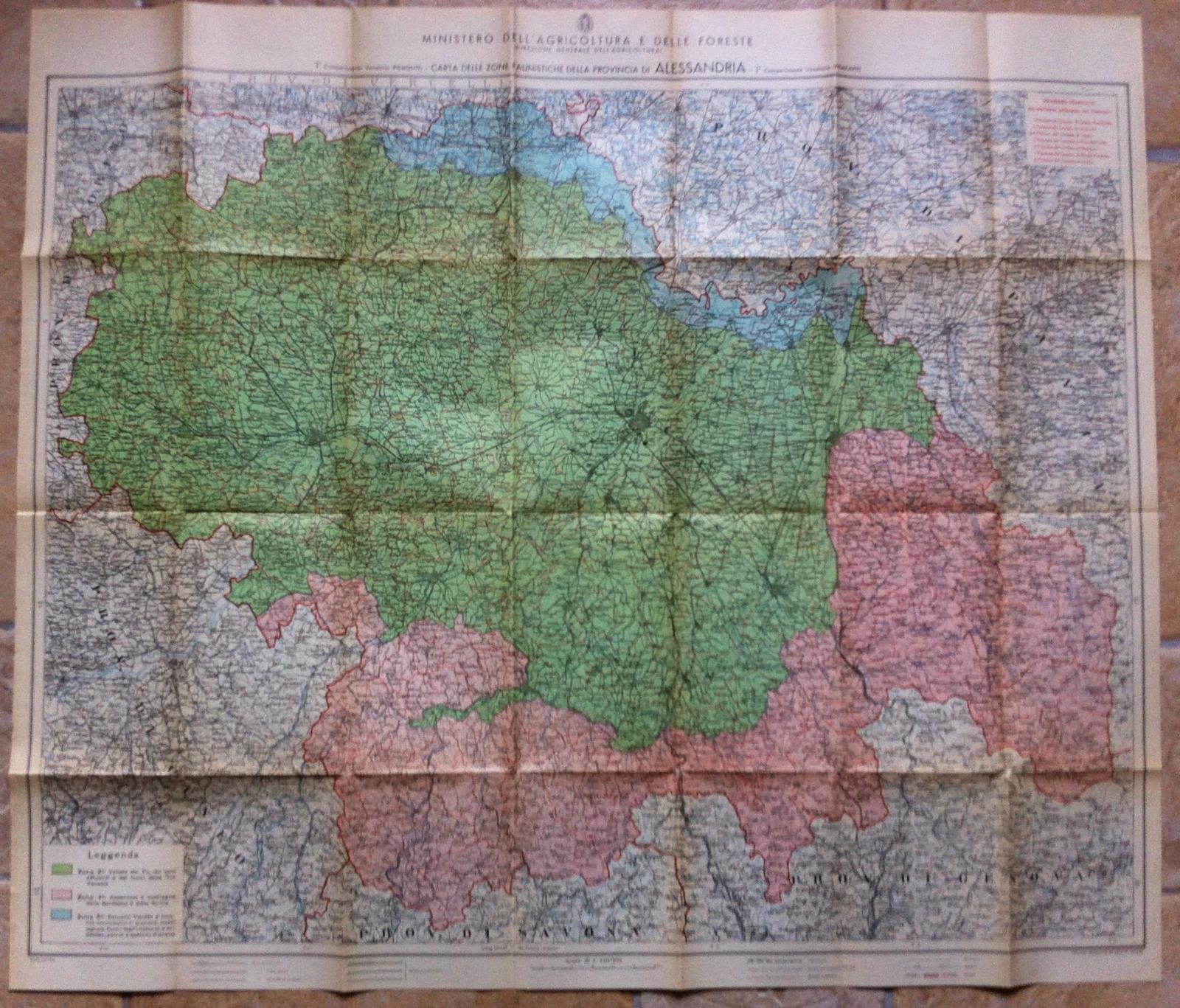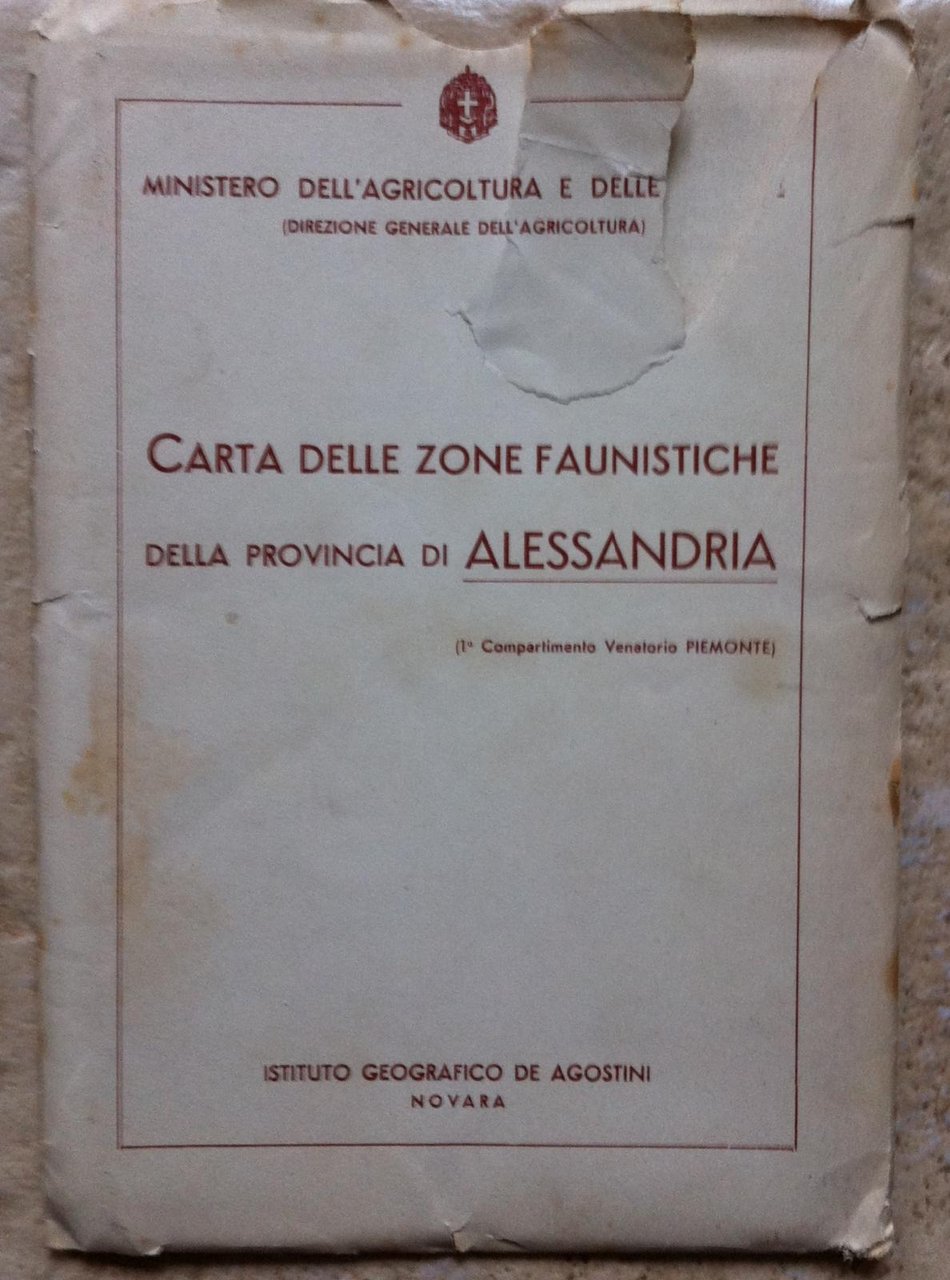 CARTA DELLE ZONE FAUNISTICHE DELLA PROVINCIA DI ALESSANDRIA 1°COMPARTIMENTO VENATORIO PIEMONTE MINISTERO DELL'AGRICOLTURA E DELLEFORESTE, DIREZIONE GENERALE DELL'AGRICOLTURA. NOVARA ISTITUTO GEOGRAFICO DEAGOSTINI, [19.] A COLORI CM 65 X 75 SUL VERSO CARTA DELLE ZONE FAUNISTICHE DEL REGNO D'ITALIA IN BUSTA UNO STRAPPO ALLA BUSTA L2839 CARTA DELLE ZONE FAUNISTICHE DELLA PROVINCIA DI ALESSANDRIA1° COMPARTIMENTO VENATORIO PIEMONTE MINISTERO DELL'AGRICOLTURA E DELLE FORESTE, DIREZIONE GENERALE DELL'AGRICOLTURA. NOVARA ISTITUTO GEOGRAFICO DE AGOSTINI, [19.] A COLORI CM 65 X 75 SUL VERSO CARTA DELLE ZONE FAUNISTICHE DEL REGNO D’ITALIA IN BUSTA CON UNO STRAPPO FRONTALE