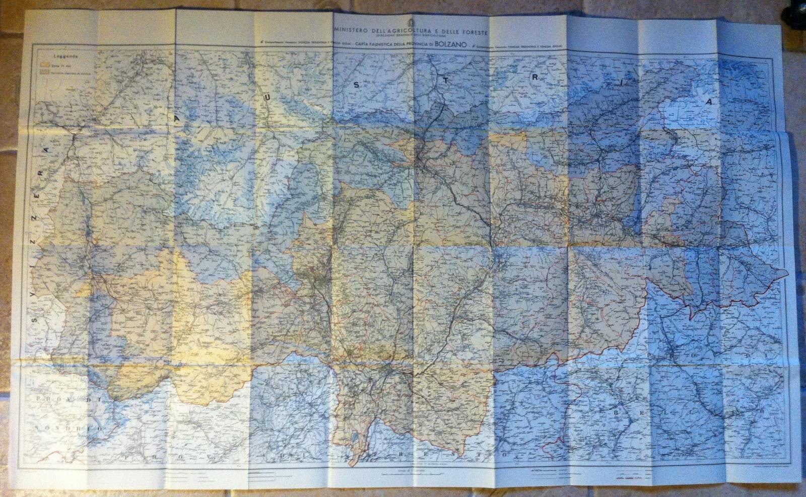 CARTA DELLE ZONE FAUNISTICHE DELLA PROVINCIA DI BOLZANO: 4° COMPARTIMENTO VENATORIO VENEZIA TRIDENTINA E VENEZIA GIULIA MINISTERO DELL'AGRICOLTURA E DELLE FORESTE, DIREZIONE GENERALE DELL'AGRICOLTURA. NOVARA : ISTITUTO GEOGRAFICO DE AGOSTINI, [19.]A COLORI CM 65,5 x 109 SUL VERSO: CARTA DELLE ZONE FAUNISTICHE DEL REGNO D’ITALIA IN BUSTA CON SEGNO A PENNA SUL RETRO DIVERSI STRAPPI SUI LATI DELLA BUSTA