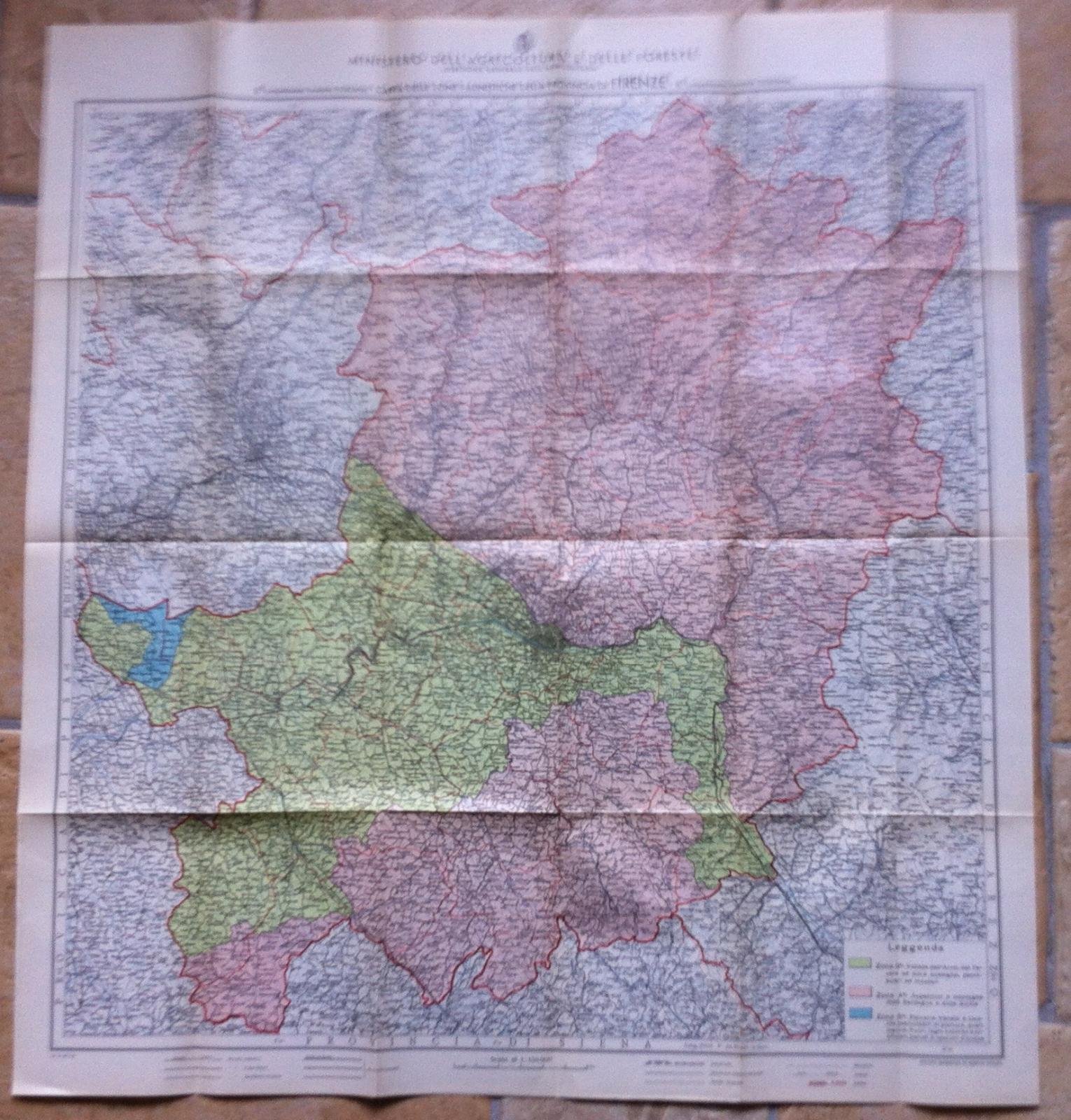CARTA DELLE ZONE FAUNISTICHE DELLA PROVINCIA DI FIRENZE8° COMPARTIMENTO VENATORIOTOSCANA MINISTERO DELL'AGRICOLTURA E DELLE FORESTE, DIREZIONE GENERALEDELL'AGRICOLTURA. NOVARA ISTITUTO GEOGRAFICO DE AGOSTINI, [19.] A COLORI CM 67,5 X 60,5 SUL VERSO CARTA DELLE ZONE FAUNISTICHE DEL REGNO D'ITALIAIN BUSTA. L2846