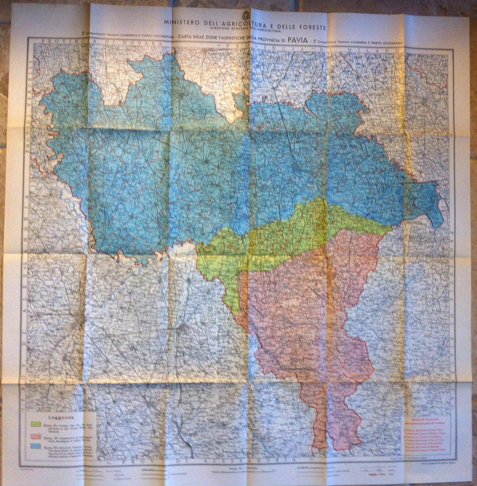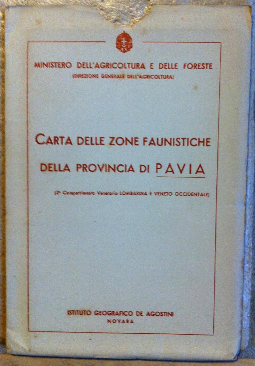 CARTA DELLE ZONE FAUNISTICHEDELLA PROVINCIA DI PAVIA2° COMPARTIMENTO VENATORIO LOMBARDIA E VENETOOCCIDENTALE MINISTERO DELL'AGRICOLTURA E DELLE FORESTE, DIREZIONE GENERALEDELL'AGRICOLTURA. NOVARA ISTITUTO GEOGRAFICO DE AGOSTINI, [19.] A COLORI CM 64 X 62,5 SUL VERSO CARTA DELLE ZONE FAUNISTICHE DEL REGNO D'ITALIAIN BUSTA L2870