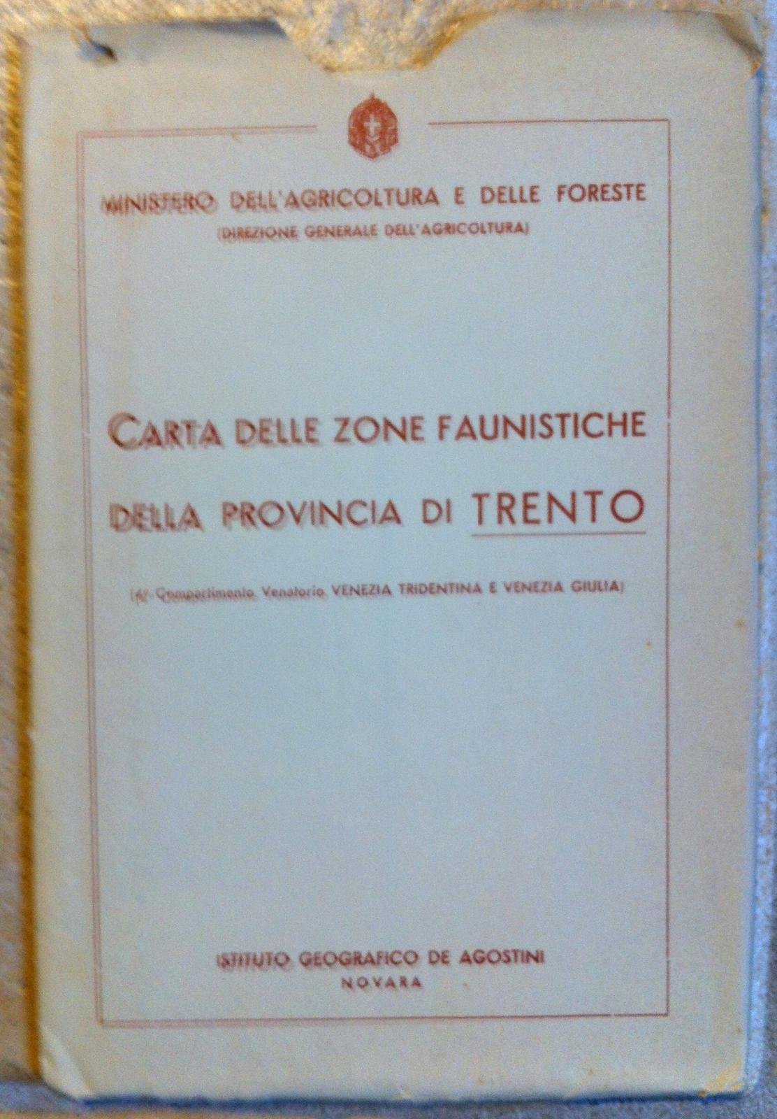 CARTA DELLE ZONE FAUNISTICHE DELLA PROVINCIA DI TRENTO C.A. 1930-L2874 CARTA DELLE ZONE FAUNISTICHE DELLA PROVINCIA DI TRENTO 4° COMPARTIMENTO VENATORIO VENEZIA TRIDENTINA E VENEZIA GIULIA MINISTERO DELL'AGRICOLTURA E DELLE FORESTE, DIREZIONE GENERALE DELL'AGRICOLTURA. NOVARA ISTITUTO GEOGRAFICO DE AGOSTINI, [19.] A COLORI CM 76 X 83,5 SUL VERSO CARTA DELLE ZONE FAUNISTICHE DEL REGNO D'ITALIA IN BUSTA.