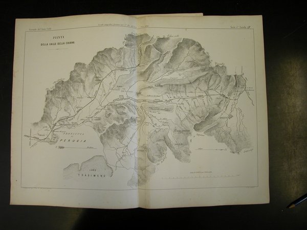 CARTA E PROFILI DELLA VALLE DELLA CHIANA. Due carte di G.Levi in litografia Pozzo, tratte da "Giornale del Genio Civile", Parte non ufficiale, Serie C, Tavole n°18-19, anno 1866.