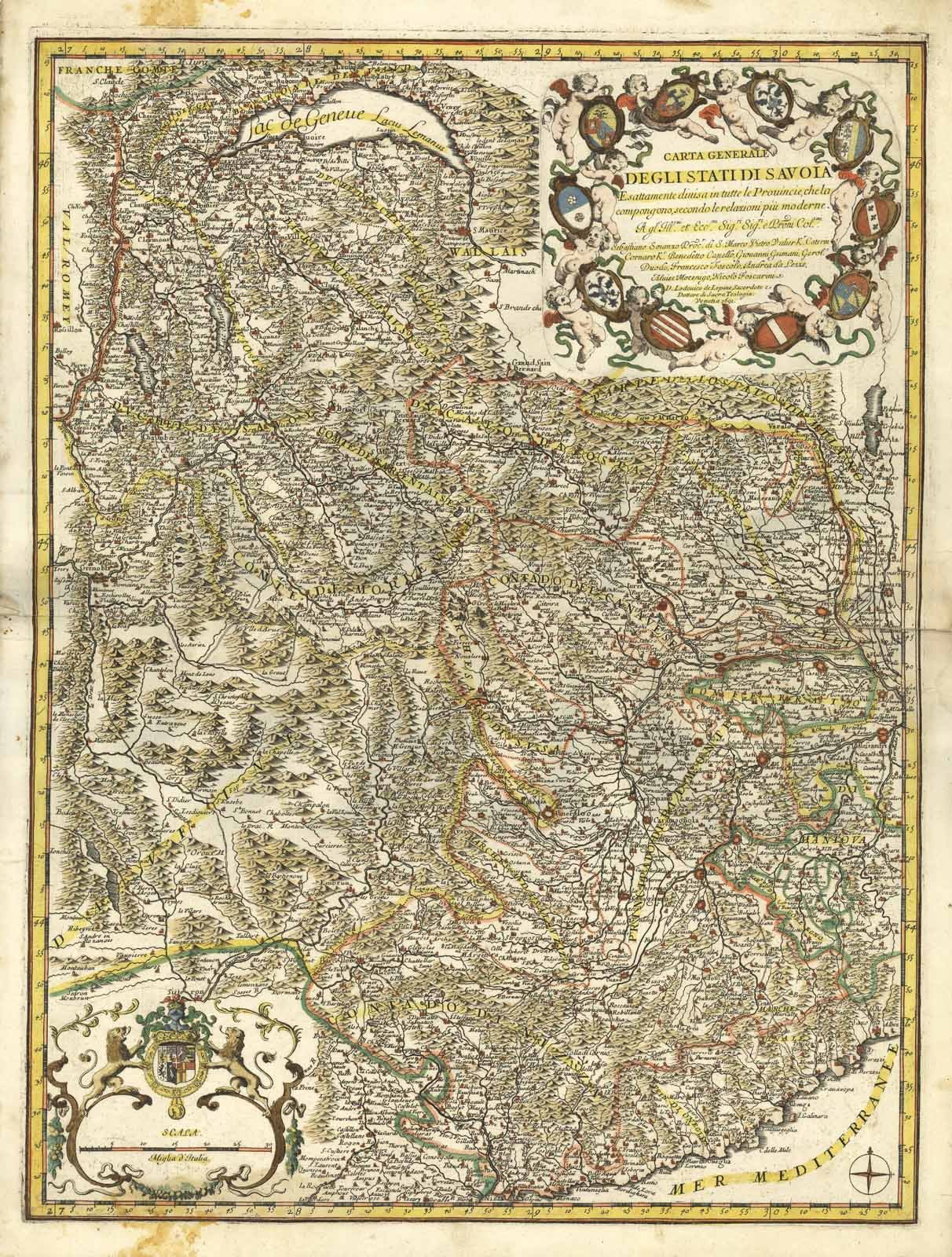 Enigmatica carta geografica degli Stati di Savoia e Piemonte, realizzata utilizzado la matrice della carta "Stati di Savoia Piemonte etc Dedicati All'Illustrissimo et Eccellentissimo Signore Ottavio Manin Procuratore di S. Marco" ad opera del Coronelli e datata 1693. Da un'attento confronto con esemplari della carta del Coronelli risulta che la nostra è sicuramente da ritenere una delle primissime tirature e questo basterebbe per lasciare ipotizzare che la matrice in fase di realizzazione, a suo tempo ancora priva di quello che diverrà il definitivo cartiglio, fu utilizzata per la realizzazione di una carta ad hoc per la quale venne realizzato un particolare cartiglio. Il cartiglio è caratterizzato da un ghirlanda di putti alati inframezzati da scudi che racchiudono il titolo "Carta Generale degli Stati di Savoia Esattamente divisa in tutte le Provincie che la compongono secondo le relazioni più moderne", segue la dedica ad eccellenti personalità quali ad esempio quella di Sebastiano Soranzo che fu eletto nel 1690 a Procuratore di S. Marco. Sotto l'articolata dedica si legge "D. Lodovico de Lepine Sacerdote e Dottore di Sacra Teologia. Venetia 1691". La carta, sconosciuta a tutte le bibliografie consultate, è caratterizzata da pregevole acquerellatura coeva. Ottimo stato di conservazione.