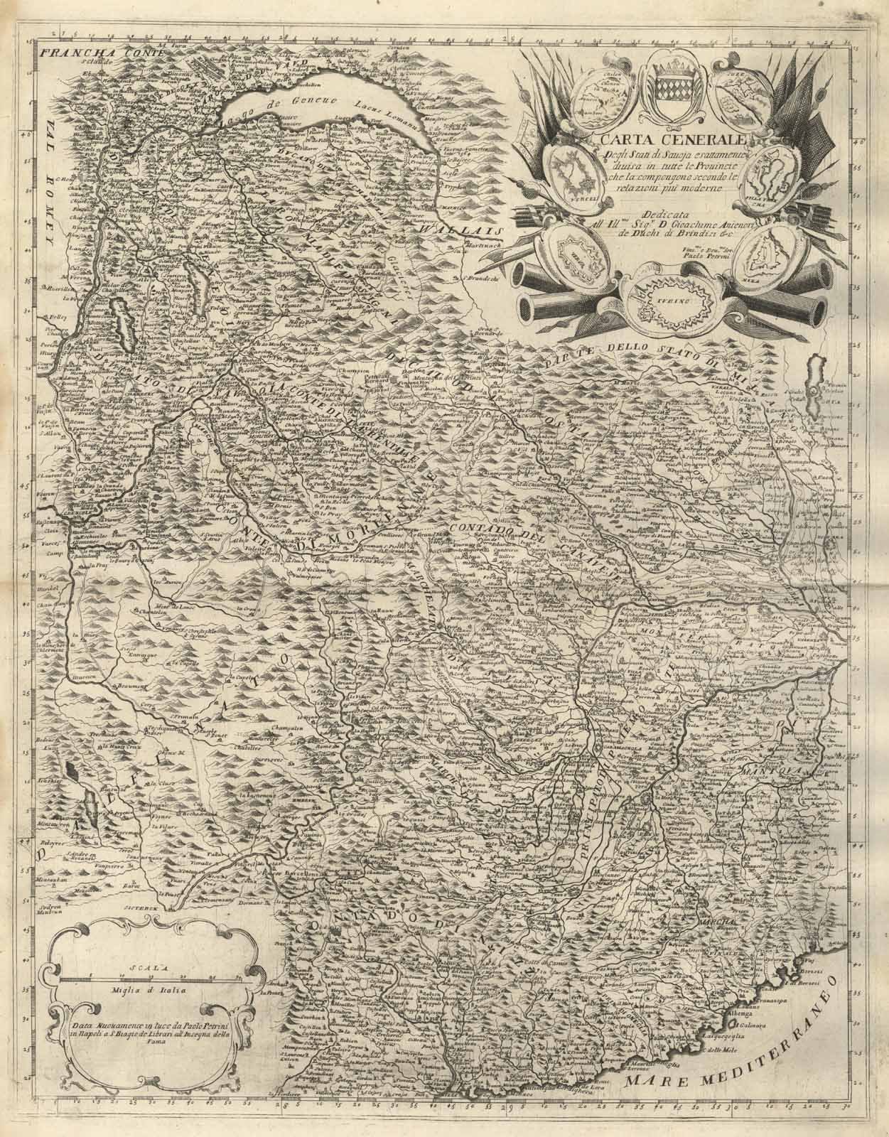 Carta geografica, entro margine graduato, raffigurante il territorio degli Stati di Savoia. Il modello di riferimento per questa carta lo si ritrova nell'opera del Padre Coronelli. Nell'angolo in alto a destra compare un ricco cartiglio in cui si trova iscritto il titolo e la dedica a "Gioachimo Antenori de Duchi di Brindisi". Nella composizione del cartiglio oltre ad elementi militari compaiono le raffigurazioni in pianta si Susa, Vercelli, Verrua, Torino, Villafranca e Nizza. L'orografia è trattata a coni di talpa con illuminazione da ovest; attenta la raffigurazione idrografica. Piega centrale editoriale, ottimo lo stato di conservazione generale. Verso gli ultimi anni del XVII secolo, il Petrini aveva iniziato a far incidere alcune carte geografiche per un atlante dal titolo "Atlante Partenopeo overo raccolta di tavole geografiche degli autori più classici ed accurati". Il frontespizio venne realizzato verso il 1700, mentre i modelli delle carte sono tutti di origine francese, per lo più di Nicolas e di Guillame Sanson, alcune sono tratte dal Baudrand e dal de Fer, solo il Regno di Napoli è copiato dalla carta realizzata da Cantelli per il "Mercurio Geografico" ed il Piemonte ripreso dalla carta di Coronelli per il suo "Corso Geographico". Petrini, come spesso accadeva per le opere impegnative e costose, la distribuì a dispense, a mano a mano che le carte venivano completate e siccome non venne mai stampato un indice delle tavole ad oggi non è possibile fornire una collazione definitiva dell'opera. Per di più i rami passarono nelle mani degli eredi di Petrini che continuarono a stamparli modificandone unicamente le date dando luogo a diverse edizioni dei fogli. (Valerio)