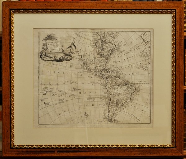 350 x 430. Vergata grossa. Filigrana non rilevata. Foglio ad ampi margini. Lieve strappo sul margine bianco sinistro. Bellissimo esemplare. Carta Generale dell'America regolata sulle più recenti carte e osservazioni astronomiche da Emm. Bowen. Toponimi. Proveniente da "Storia degli stabilimenti europei in America divisa in sei parti nelle quali oltre una breve notizia della scoperta, e conquiste fatte in quella parte di mondo de' costumi, e maniere de' popoli originarj, si da un'esatta descrizione delle cola stabilite colonie . Tradotta in italiano dalla seconda edizione inglese. Volume primo -secondo". Traduzione italiana di "An account of the European settlements in America" London 1747, opera attribuita a Edmund e William Burke. Emanuel Bowen, map and print seller, engraver to George II and to Louis XV of France worked in London from 1714 producing some the best and most attractive maps of the 18th century. He had plans for completing a major County Atlas but, finding the task beyond his means, joined with Thomas Kitchin to publish "The Large English Atlas". Many of the maps were issued individually from 1749 onwards and the whole atlas was not finally completed until 1760. With one or two exceptions they were the largest maps of the counties to appear up to that time (27" x 20") and were unusual in that blank areas around each map are filled with historical and topographical detail which makes fascinating and amusing reading. The atlas was reissued later in reduced size. Apart from his county maps and atlases of different parts of the world he also issued (with John Owen) a book of road maps based, as was usual at that time, on Ogilby but again incorporating his own style of historical and heraldic detail. Thomas helped his father during his lifetime and produced many fine maps in his own right after his fathers death.