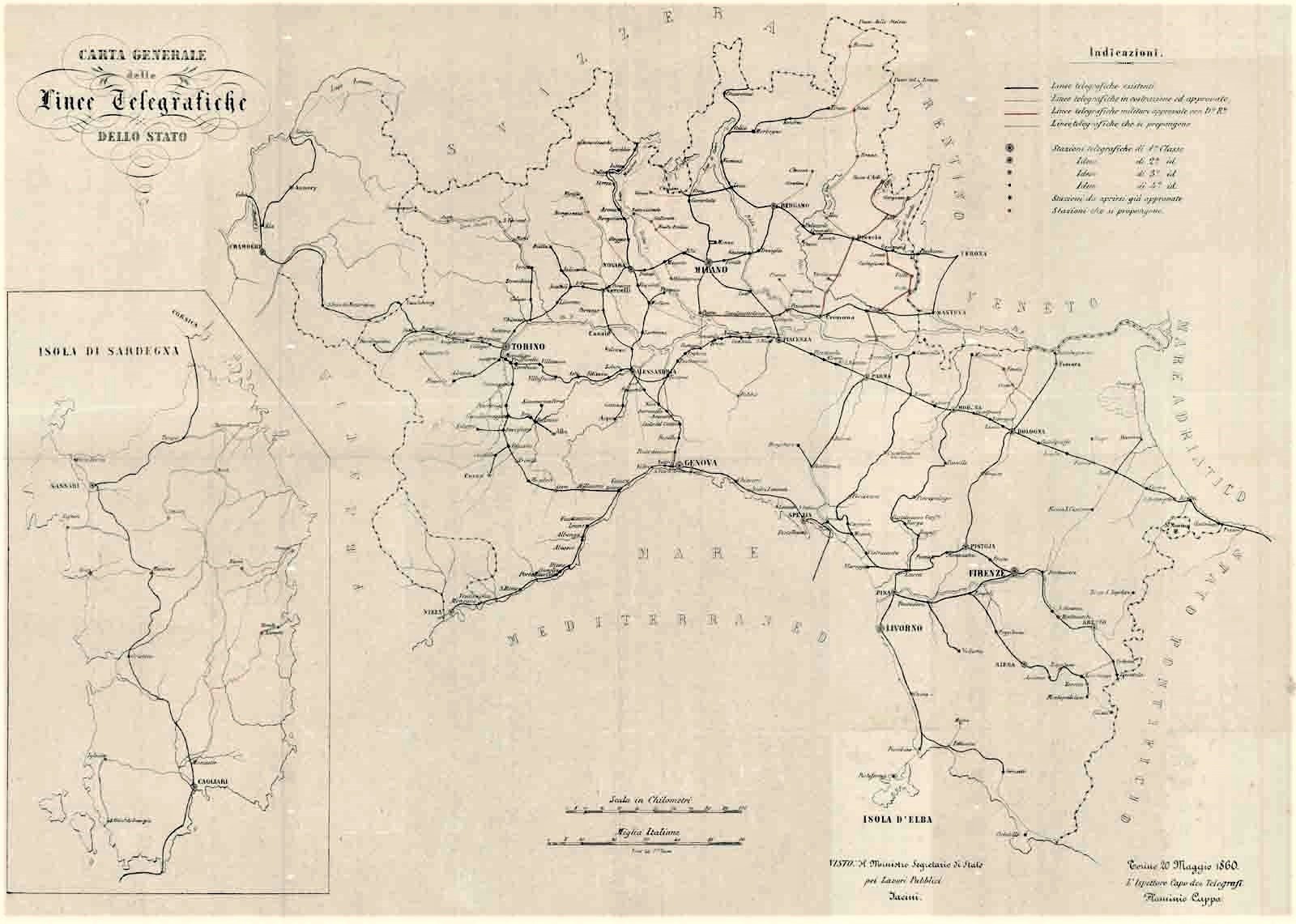 Interessante e rara carta geografica, antica originale del 1860, raffigurante le linee telegrafiche dello stato; è allegato il decreto, di Vittorio Emanuele II Re di Sardegna, di approvazione delle nuove linee telegrafiche del 8 luglio 1860. In basso a sinistra entro riquadro l’isola di Sardegna
