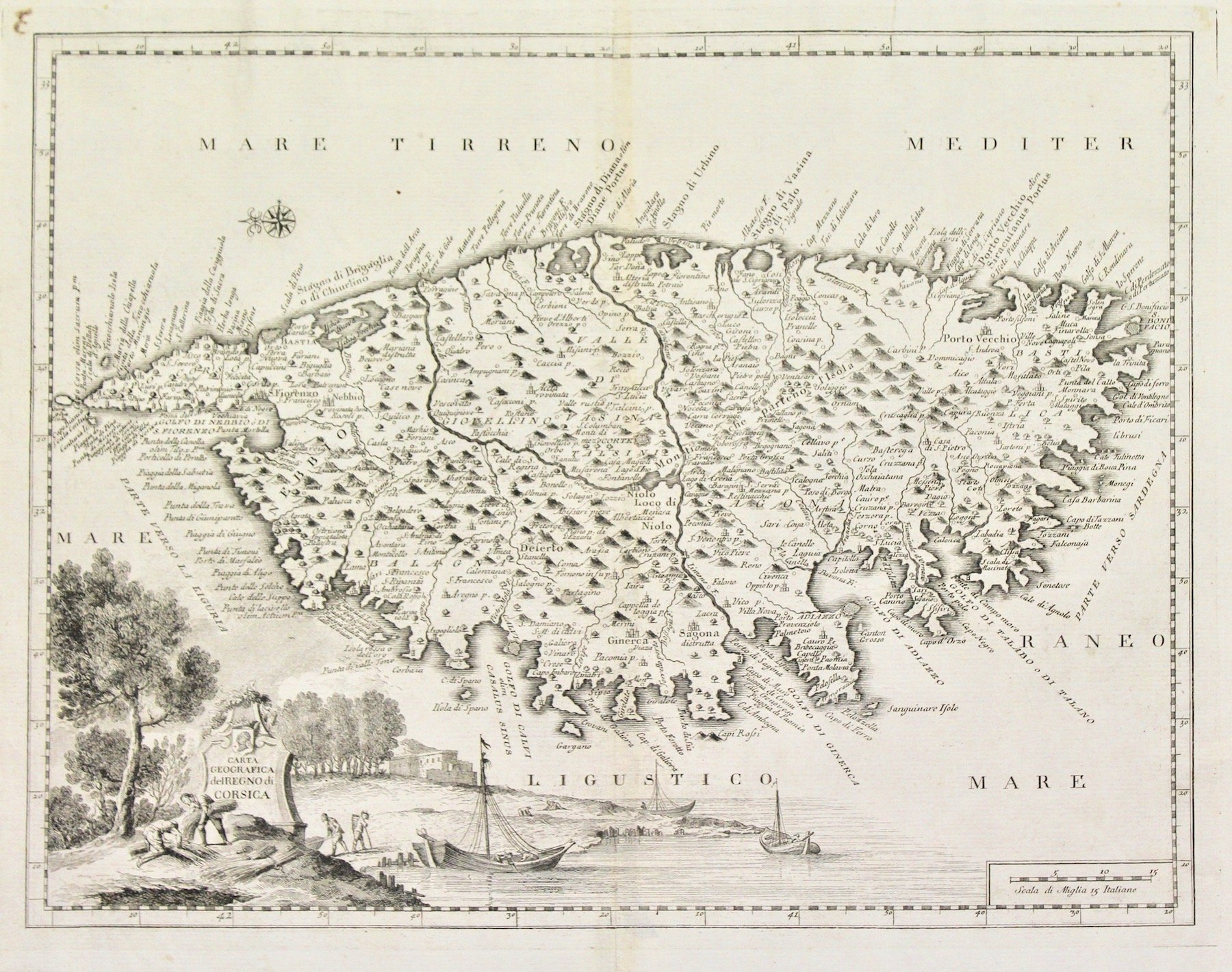 Incisione in rame, mm 335x430. Piacevole carta dell'isola con cartiglio figurato in basso a sinistra. Tratta da "Atlante novissimo". Ottimo esemplare.