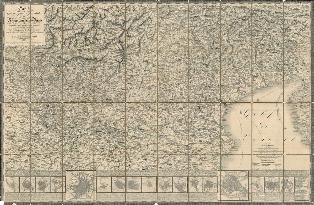 Carta geografica murale, antica originale del 1851, del Regno Lombardo Veneto applicata su tela a 28 stacchi. In basso per la lunghezza della carta sono raffigurate le piante topografiche delle seguenti città: Como, Pavia, Lodi, Bergamo, Milano, Sondrio, Cremona, Brescia, Mantova, Verona, Vicenza, Rovigo, Padova, Venezia, Belluno, Treviso e Udine. Piccole mancanze lungo il bordo della carta (margine inferiore). Complessivamente buon esemplare