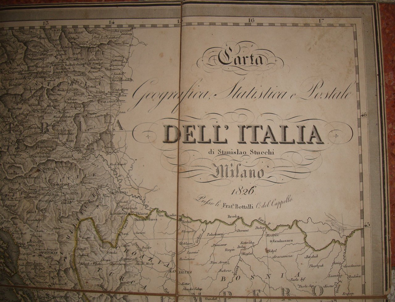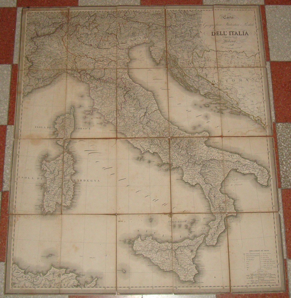 Milano, Bettalli, 1826. Incisione in rame riportato su tela a sezioni. I confini con coloritura coeva. Cm.90x77.