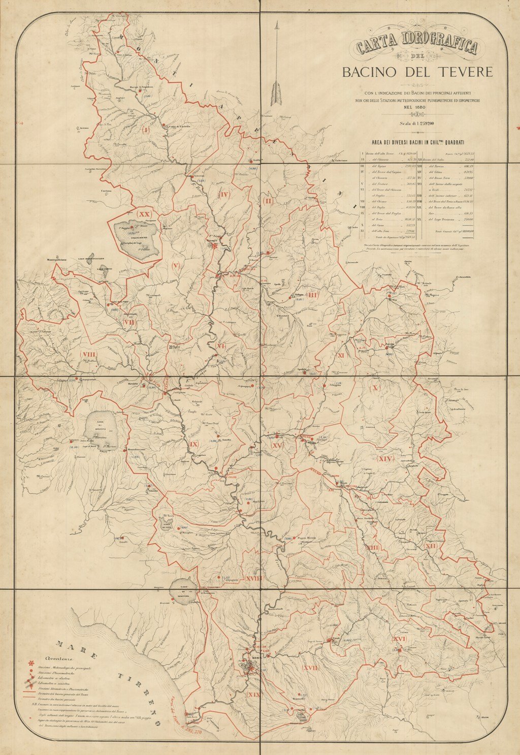 Carta idrografica del bacino del Tevere applicata su tela a stacchi. Interessante carta del territorio umbro e laziale, orientata ma non graduata, in cui è ben evidente il corso del fiume Tevere e di tutti i suoi affluenti. In alto a destra il titolo, in cui è specificato che nella carta oltre agli affluenti sono riportate le Stazioni Meteorologiche Pluviometriche e Idrometriche ed è esplicitata la scala di 1:259.200. Sotto al titolo vengono elencati i diversi bacini dell'area. In basso a sinistra breve legenda in cui sono riportati i vari segni convenzionali: Stazioni Metereologiche, Stazioni Pluviometriche, Idrometro a destra, Idrometro a sinistra e Stazioni Idrometriche e Pluviometriche. Ottima conservazione