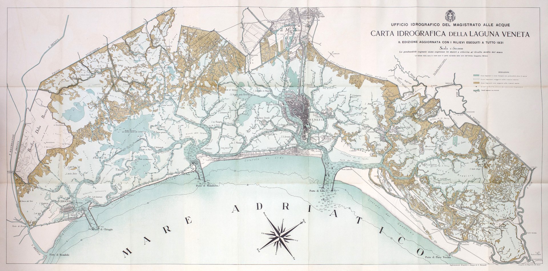 II edizione aggiornata con i rilievi eseguiti a tutto Cromolitografia, pieghe editoriali, mm 500x1030. Eseguita da O. Bernardi. Bella carta della laguna con indicazione a tinte diverse delle zone lagunari di differente tipo. Molto ben conservata <BR>
