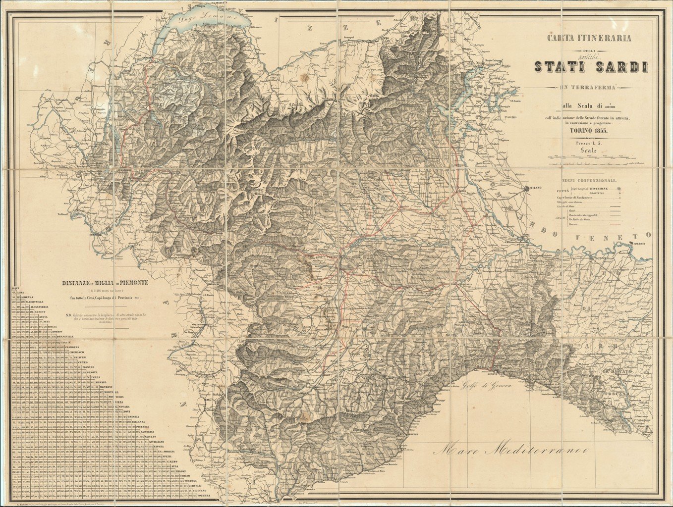 Carta geografica, antica originale del 1853, del Piemonte montata su tela a stacchi. Sotto al titolo la legenda dei segni convenzionali. Interessante, come già dichiarato nel titolo della stessa, l'indicazione delle stradde ferrate, la cui indicazione è evidenziata da un segno rosso. Nell'angolo in basso a sinistra sono riportate le distanze in Miglia di Piemonte fra tutte le Città, Capi-luogo di Provincia etc.
